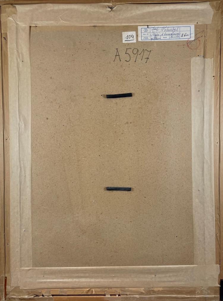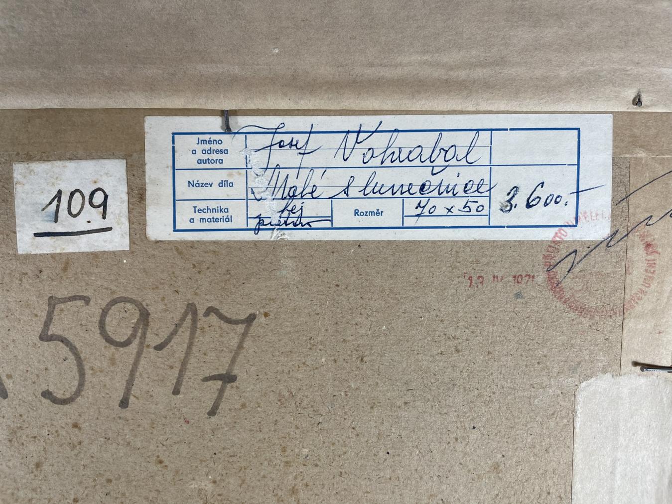 Rozměr díla 68 x 48,5 cm, včetně rámu 81,5 x 68 cm, za sklem, signováno v pravém dolním rohu "Vohrabal 65"