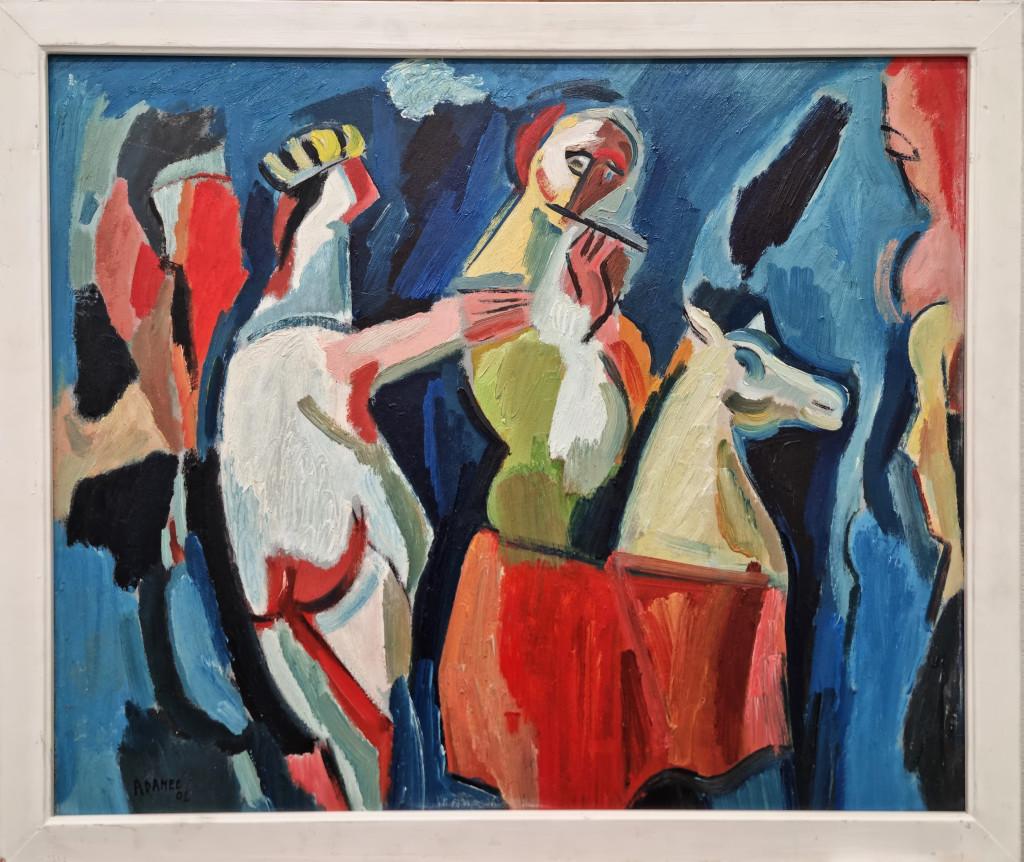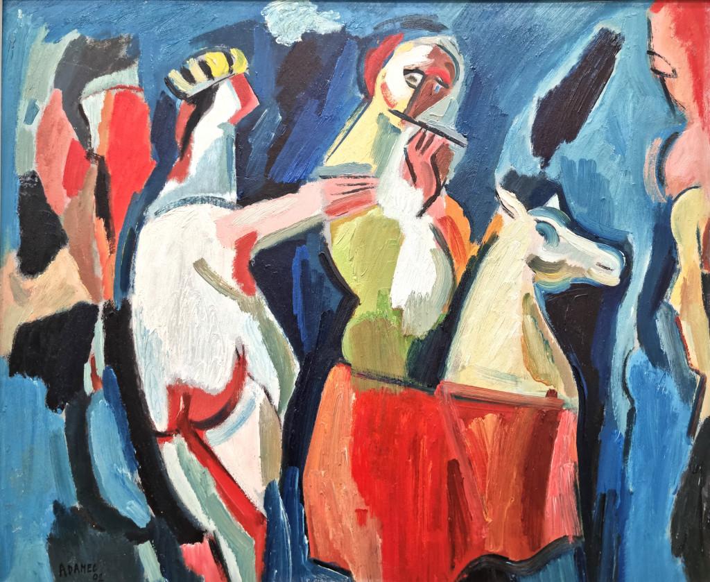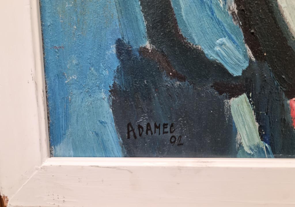 Toto dílo hýří všemi barvami a tvary. Malba je lehce laděna do kubistického stylu, další asociací může být i umělecký styl fauvismus. Díváme se na podivné setkání figur, na stole září koňská hlava. Místnost vyplňují barevné stíny. Olej na sololitu, rozměry s rámem 61 x 51 cm, rozměry malby 54 x 45 cm. Signováno vlevo dole "Adamec 92".
