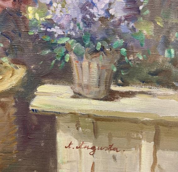 Olej na plátně o rozměrech malby 66 x 50 cm, s rámem 86 x 68 cm. Signováno v pravém dolním rohu "A. Augusta". Rám lokálně poškozen.