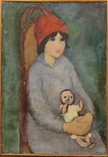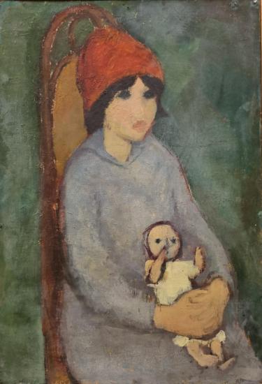 Dílo z rané tvorby?? Aloise Mikulky. Námětem se stala sedící holčička v rudém kulichu, která drží panenku. Mikulka v díle šetří detailem, malbu tvoří spíše za pomocí barevných ploch bez výraznějšího promalování, v tomto obraze se lehce začíná rýsovat jeho rukopis. Motivy si výrazně zjednodušuje a přetváří do svého hravého stylu. Olej na sololitu, rámováno, rozměry s rámem 50,5 x 35 cm, rozměry díla 48 x 33 cm. Nesignováno.