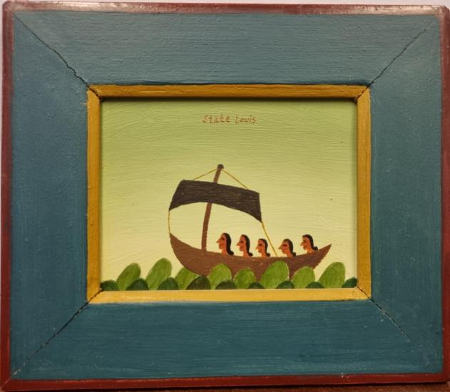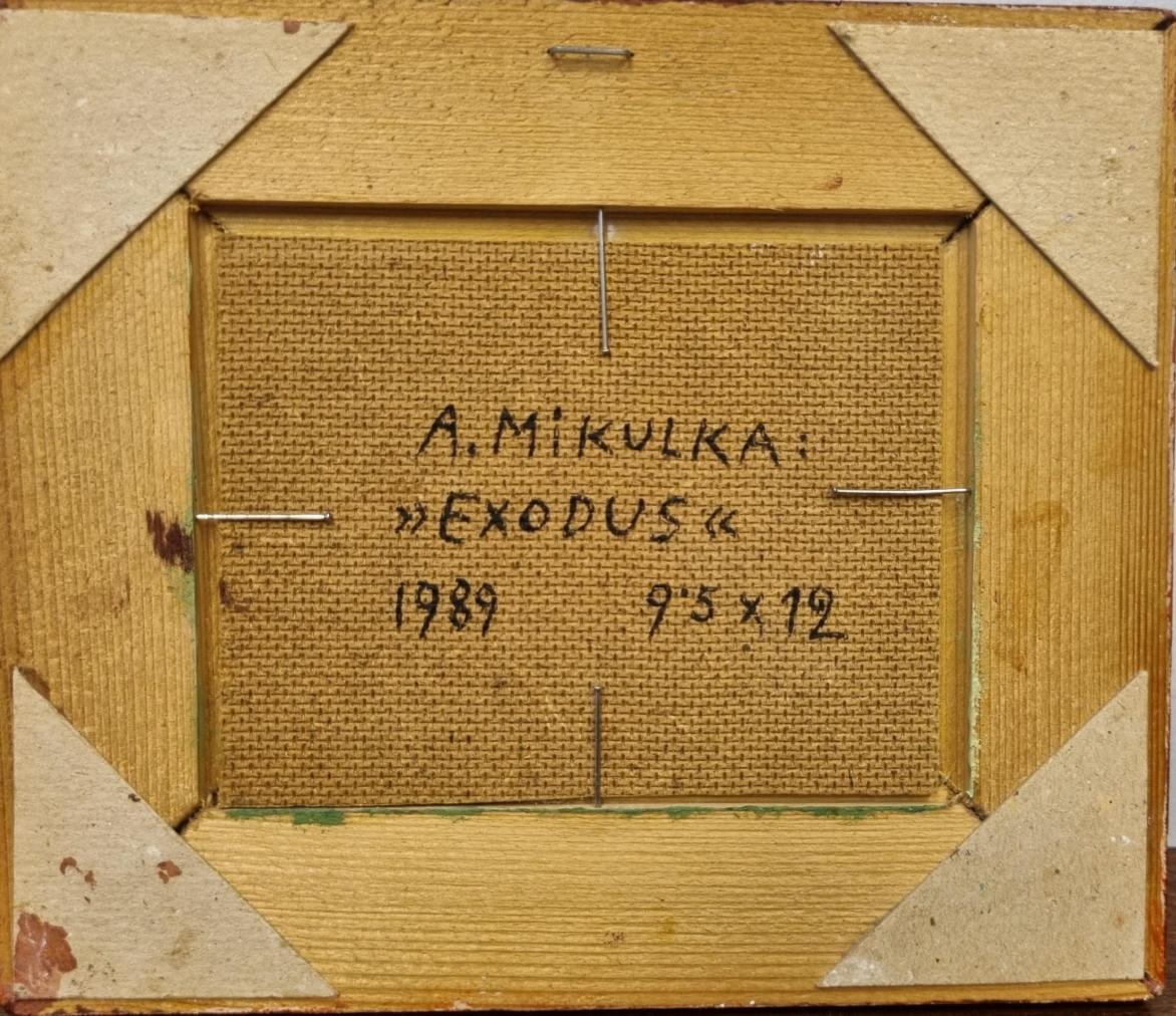 Drobný obraz od Aloise Mikulky. V díle sledujeme jednoduchý výjev loďky, která pluje po rozvlněném moři, na palubě, v řadě za sebou, sedí pět stejných žen. Mikulka využívá svůj oblíbený princip opakování totožného námětu v rámci jednoho díla, čímž v díle utváří rovinu univerzality, zároveň je to prvek, který je často nositelem vtipu. Olej na sololitu, rámováno, rozměry s rámem 17 x 20 cm, rozměry díla 12 x 9,5 cm. Signováno nahoře uprostřed "State Loius" a ze zadní strany "A. Mikulka, Exodus, 1989".