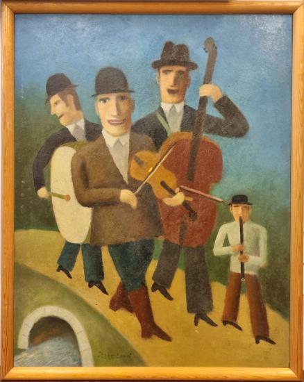 Obraz od Aloise Mikulky. Po mostě kráčí skupinka hudebníků, každý z nich má svůj hudební nástroj. Mikulka si typicky hraje s perspektivou, v díle vnímáme prostor díky použitým zkratkám a zjednodušení. Postava vpředu je komicky malá oproti ostatním. Olej na kartonu, rámováno, rozměry s rámem 47 x 37 cm, rozměry díla 44 x 34 cm. Signováno v pravém dolním rohu "State Louis".