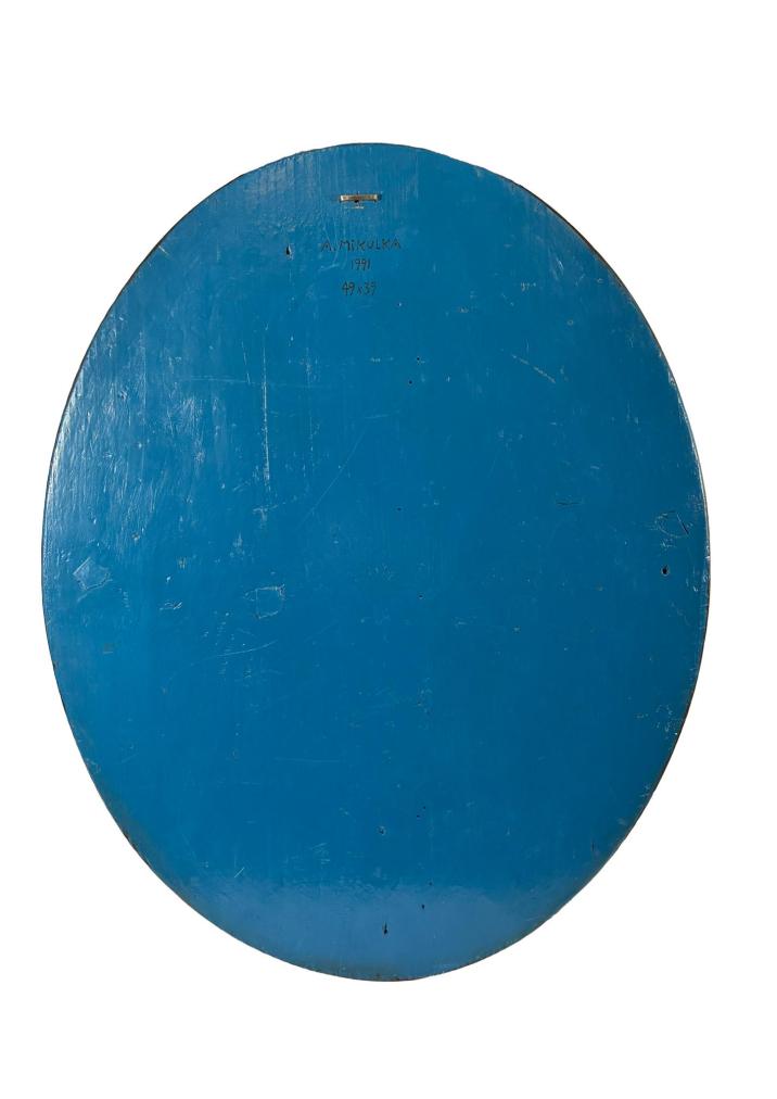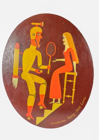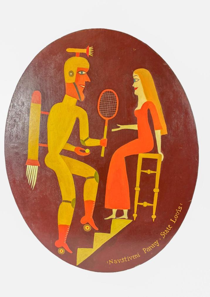 Malba od autora Aloise Mikulky v oválném formátu. Na tmavě hnědém pozadí vytváří Mikulka situaci, kde panna sedí na trůně a přilétá k ní muž-sportovec. Na muži je komické, že má vybavení na tenis i bruslení, k tomu ještě létající stroj na zádech. Mikulkova malba je čistá, vytváří jednoduché plochy, bez kontur a stínování, nechává motivy vyznít v ploše. Olej na dřevě, nerámováno, rozměry 49 x 39 cm. Signováno vpravo dole "State Louis", ze zadní strany "A. Mikulka 1991, 49 x 39"