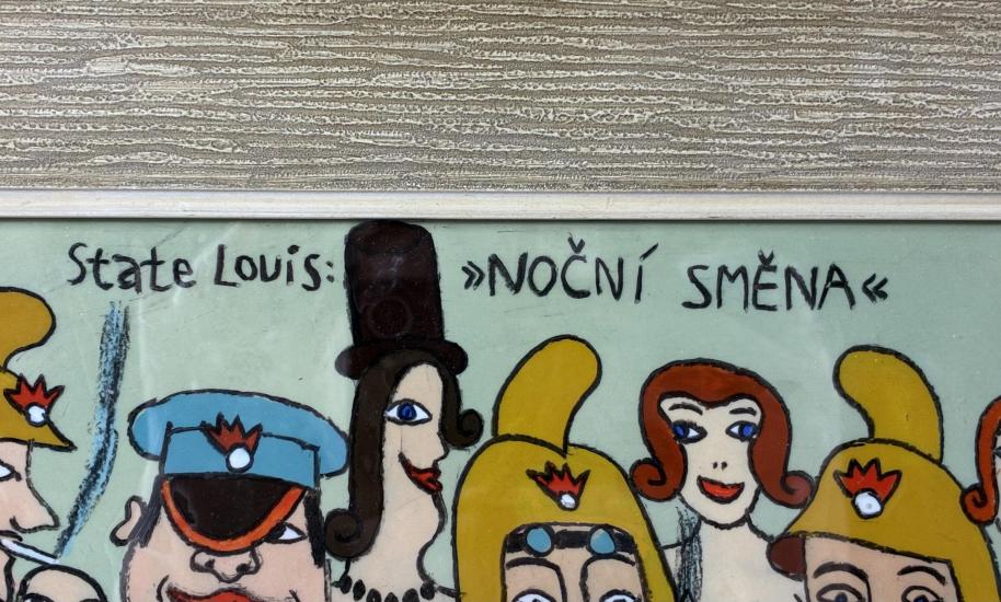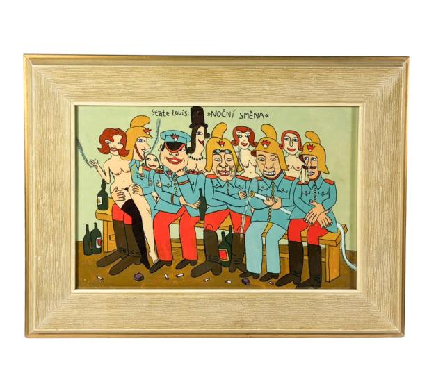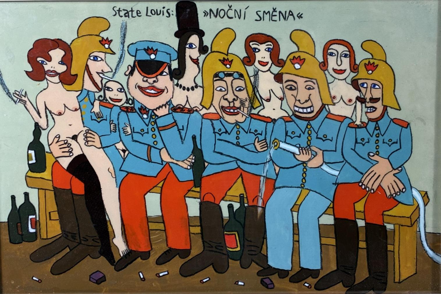 Vtipný obraz s názvem Noční směna od Aloise Mikulky. V řadě za sebou sedí hasiči, kteří zrovna pořádají večírek, v obložení alkoholu, cigaret a nahých dam. Mikulka vždy skvěle řeší kompozici a pracuje s dávkou vtipu. Podmalba na celofánu, rámováno pod sklem, rozměry s rámem 47 x 36 cm, rozměry díla 35 x 23 cm. Signováno ve vrchní části "State Loius", vedle název "Noční směna".