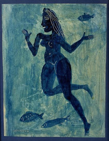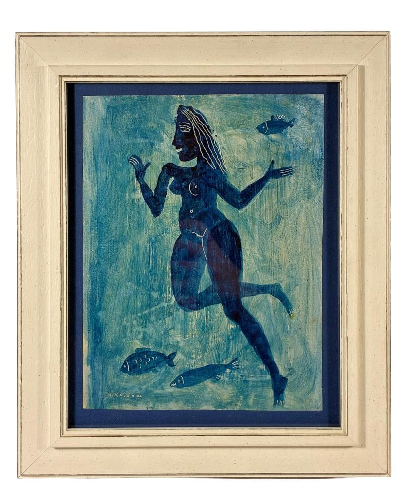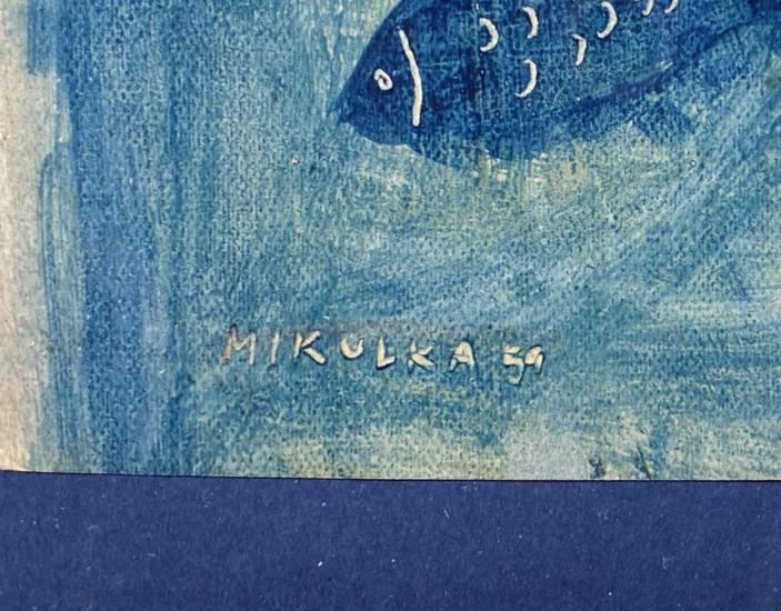 Pěkná malba od Aloise Mikulky s námětem ženy, která se potápí s rybami. Umělec vytváří modrou plochu, do které přidává tmavším odstínem modré barvy figuru ženy. Kresbu a detaily na postavě a rybách vytváří vyškrabáváním do barvy, a tak bílá linka upřesňuje motivy. Olej? na papíře, rámováno pod sklem, rozměry s rámem 30,5 x 26 cm, rozměry díla 21,5 x 16 cm. Signováno vlevo dole "Mikulka 59".