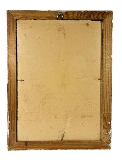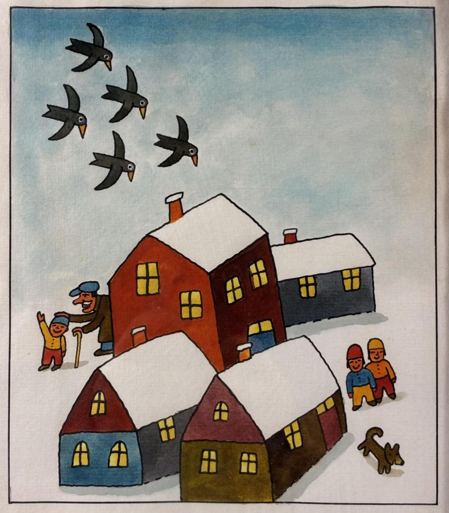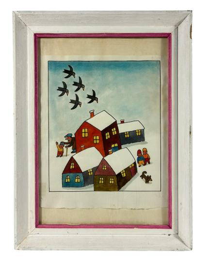 Roztomilé dílo od Aloise Mikulky. V centru se nachází 4 malebné chaloupky, nad kterými víří hejno vran. Ve sněhu jsou děti se psem a dědeček, kteří si užívají zimních radovánek. Umělec zajímavým způsobem pracuje s bílou plochou papíru, která se v jeho pojetí stává sněhem. Na horizontu jemným gradientem vytváří modré nebe. Akvarel na papíře, rámováno pod skelm, rozměry s rámem 34,5 x 26 cm, rozměry díla 20 x 17 cm. Nesignováno.
