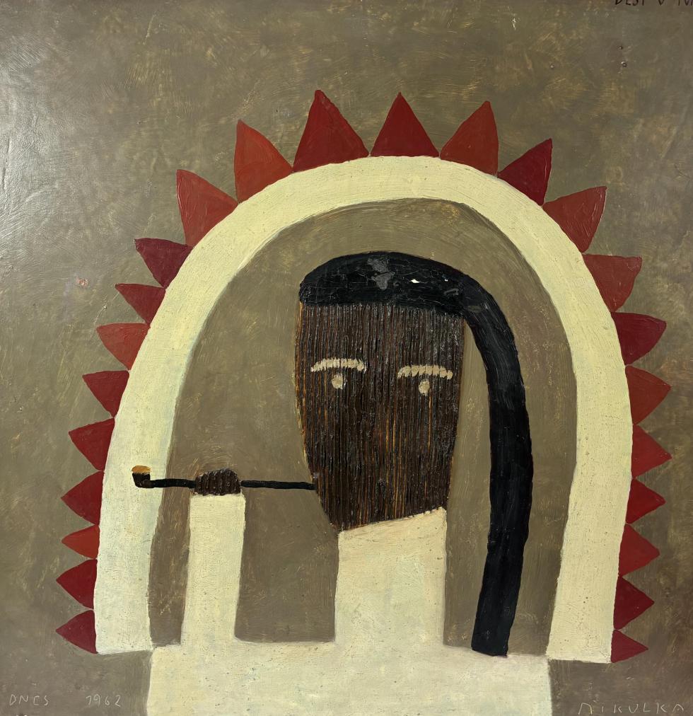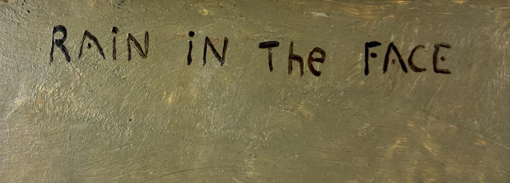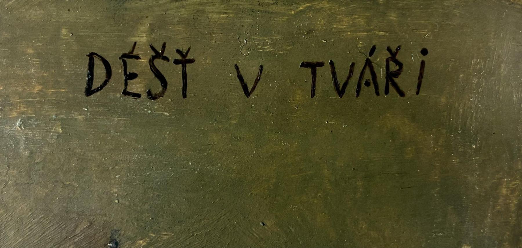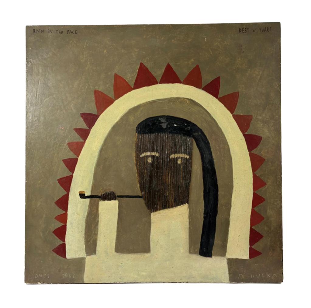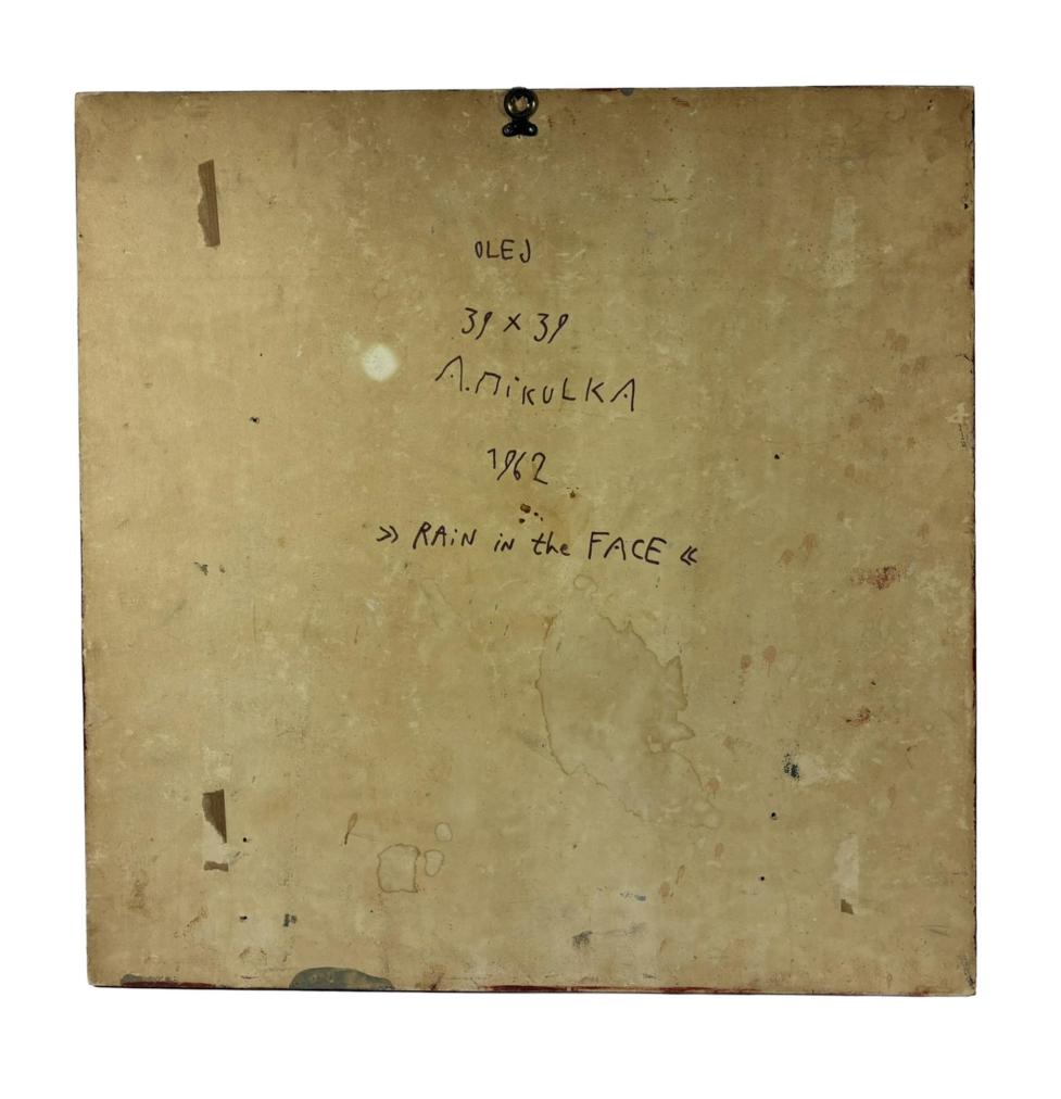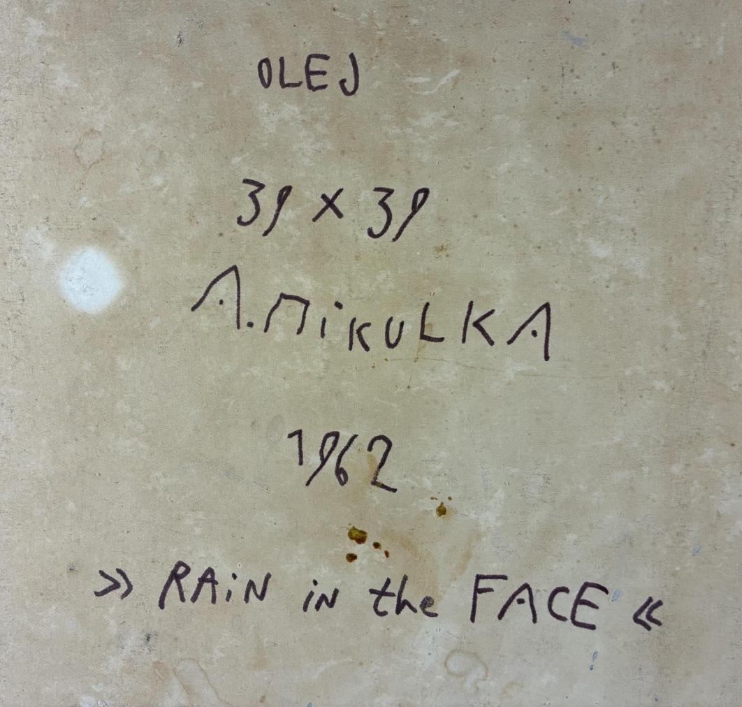 Dílo od Aloise Mikulky vyobrazující postavu s fajfkou. Olej na desce. Rozměry malby jsou 39 x 39 cm. Název se nachází nahoře- Rain in the face, déšť ve tváři. Na spodní straně vpravo nápis- dnes 1962, na levé straně signatura- Mikulka. Nerámováno. V prostřední části na hlavě patrná krakelace a vypadení barvy. Zadní strana nese nápis viz foto. A. Mikulka 1962.