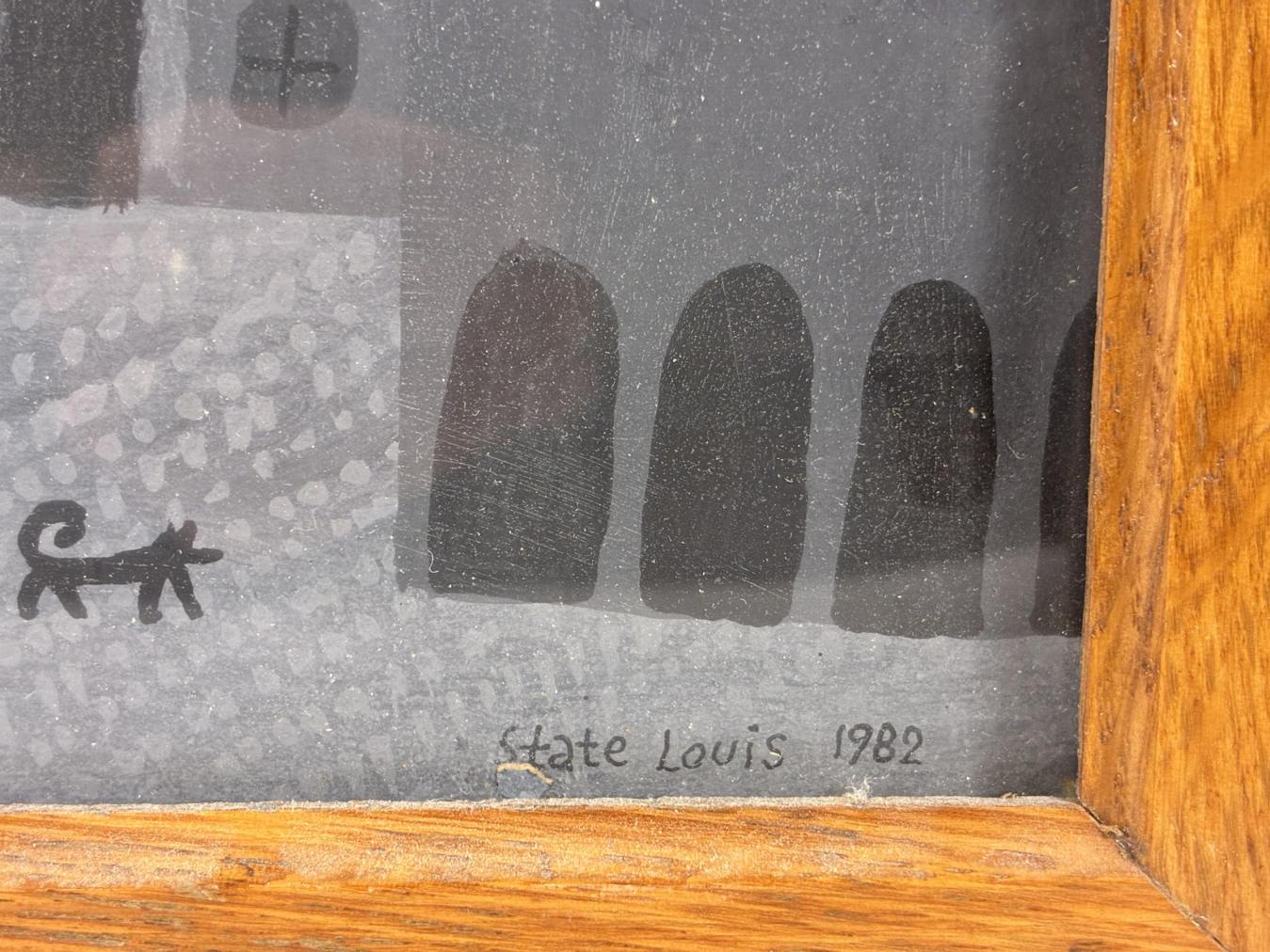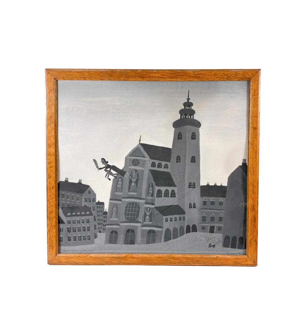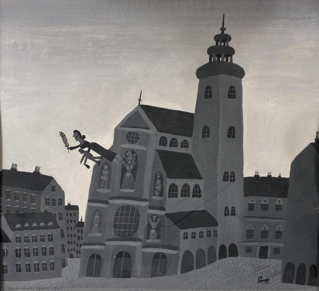 Dílo v odstínech šedé a bílé barvy od Aloise Mikulky. Většinu díla zapňuje architektura s kostelem v centru, autorovým častým námětem je opilec. V tomto díle ho anděl strážný nese za svítání domů. Opilec drží ještě flašku a nechá se unášet po nebi, pro autorova díla je typický laskavý humor. Latex na kartonu, rámováno pod sklem, rozměry s rámem 40 x 37 cm, rozměry díla 37 x 34 cm. Signováno v pravém dolním rohu "State LOuis 1982!, ze zadní strany "State Louis, latex, 37 x 34".