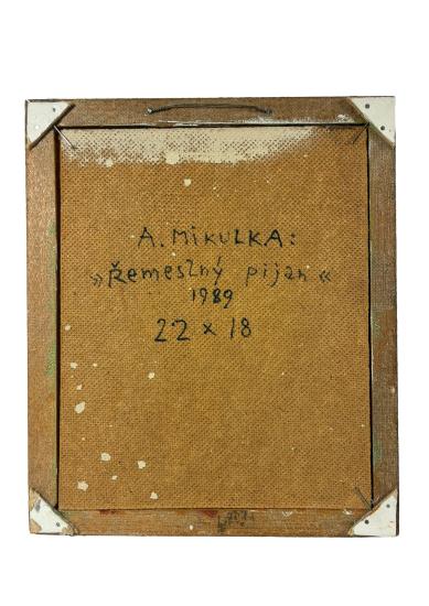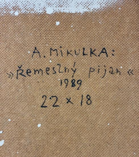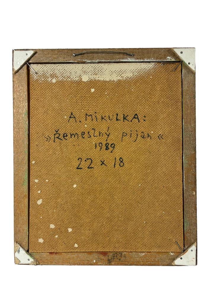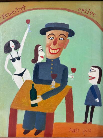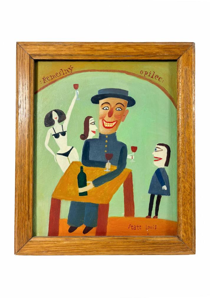 Malba od Aloise Mikulky s názvem Řemeslný pijan. Mikulkovy obrazy jsou nabité vtipem, používá osobitou stylizaci, která odkazuje k divadelnímu světu, s nímž byl úzce spjatý. V díle sahá po zkratce a jednoduchosti, za spokojeným opilcem stojí vyděšená malá dívka, které zrovna nabízí sklenku vína jedna z tanečnic v pozadí. Olej na sololitu, rámováno, rozměry s rámem 26 x 22 cm, rozměry díla 22 x 18 cm. Signováno vpravo dole "State Louis", ze zadní strany "A. Mikulka, Řemeslný pijan, 1989, 22 x 18".