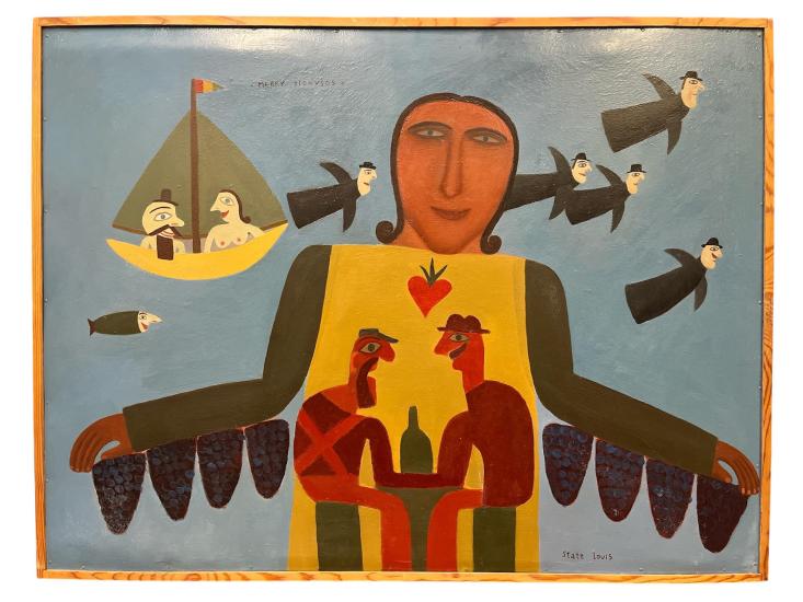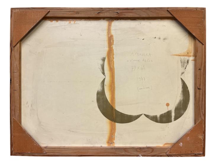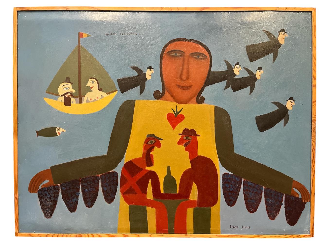 Skvělé dílo od Aloise Mikulky. Autor vytváří úžasně promyšlenou kompozici, do centra staví Dionýse, kterému z paží visí hrozny. V jeho trupu vidíme pohled na dva opilce, kteří vedou rozpravu nad otevřenou flaškou. Umělec pracuje se zkratkami, opakováním motivu a symetrií. Olej a lak na desce, rámováno, rozměry s rámem 79 x 61 cm. Signováno v dolní části obraz "State Loius" a ze zadní strany "A. Mikulka, 1977".
