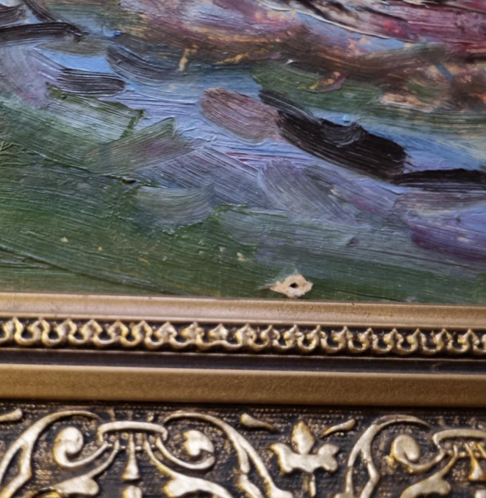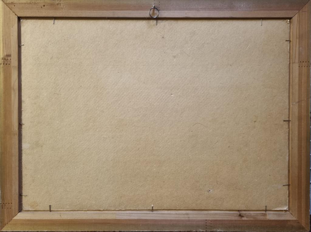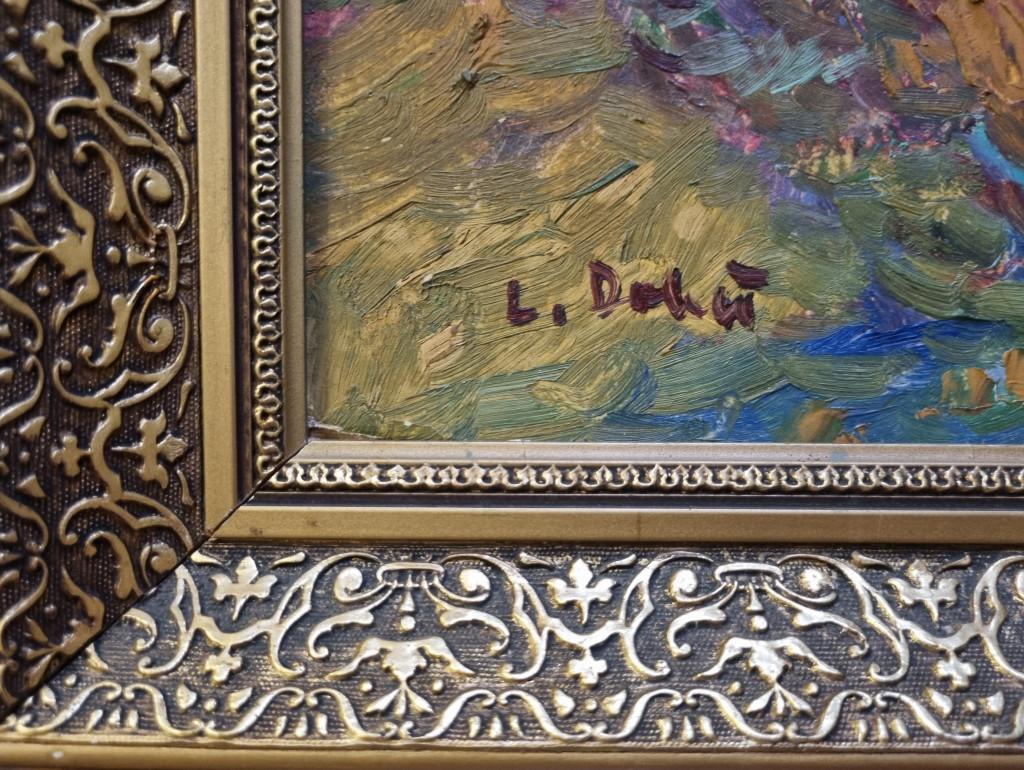 Typická malba od Ludvy Dobeše z prostředí návsi. Autor používá velmi kontrastní barvy, nebojí se sáhnout i po růžových, fialových či pleťových odstínech, kterými ztvárňuje detaily chalupy, stromů, či cestičky. V tomto výbuchu barev se mu daří vytvořit vesnické prostředí v plné kráse, které srší letní atmosférou. Umělec typicky nanáší velké vrstvy barev přes sebe, což dílu dodává další rozměr. Olej na sololitu, rozměry s rámem 81 x 61 cm, rozměry díla 69 x 49 cm. Signováno vlevo dole "L. Dobeš".