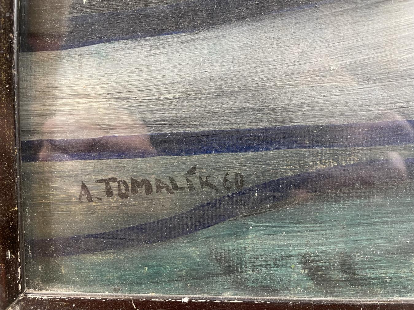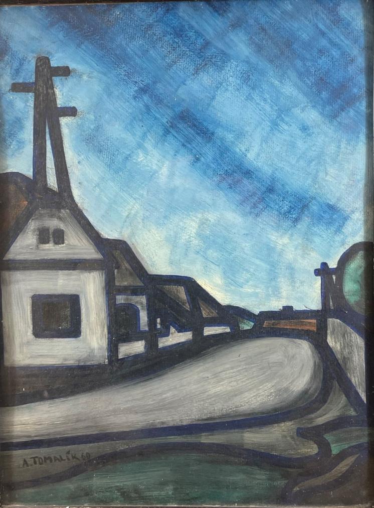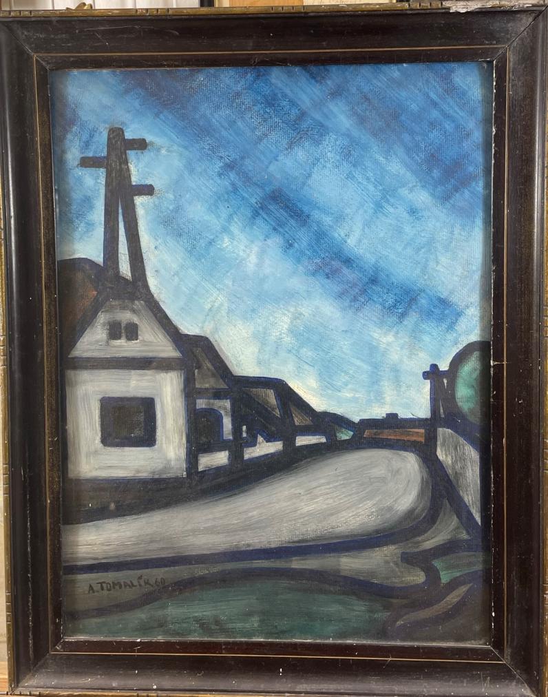 Rozměr malby: 41 x 31 cm, rozměr rámu: 49 x 38 cm, kombinovaná technika na kartonu, signováno roku 1960