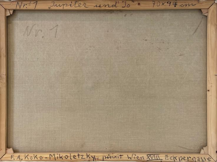 Obraz olej na plátně o rozměrech malby 92 x 70 cm , včetně rámu 106 x 82 cm, signováno F.A. Koko Mikoletzky. Rám lokálně poškozen, malba je v jednom místě lehce zezadu promáčklá, vidno pouze při pohledu z boku.