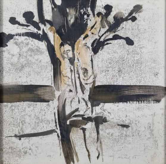 Dílo od Miroslava Netíka na motiv ukřižování Krista. Netíkovy náměty často balancují na pomezí abstrakce a konkrétních motivů, do energické změti čar ukrývá motiv Krista na kříži, tvoří prostřednictvím hnědých tahů štětce, které doplňují plochy tělového odstínu. Zbytek díla vyplňuje patina tvořena na bílém podkladu. Kombinovaná technika na sololitu, rámováno pod sklem, rozměry s rámem 40 x 40 cm, rozměry díla 29 x 29 cm. Signováno vpravo dole "M. Netík 89".
