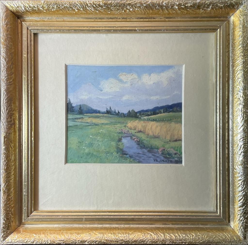 Rozměr díla 18 x 16 cm, včetně rámu 35 x 35 cm, olej na kartonu, za sklem, signováno v pravém dolním rohu "Fr. Langr" .