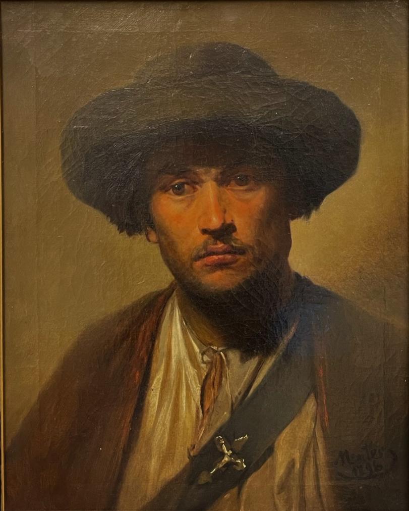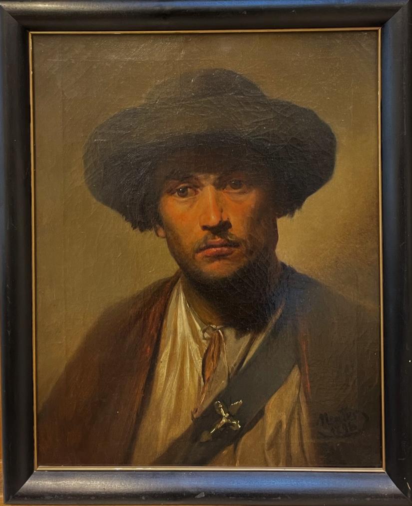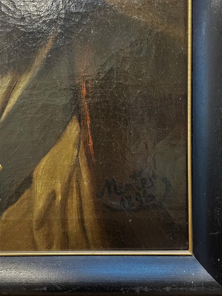 Obraz olej na plátně, rozměr malby 50,5 x 40 cm, včetně rámu 58,5 x 48 cm. Signováno vpravo dole "Mentes 1896".