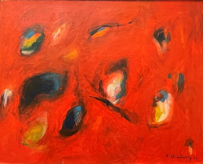 Rozměr díla 42,5 x 34,5 cm, včetně rámu 44 x 35,5 cm, olej na sololitu ,signováno v pravém dolním rohu "R. Hliněnský 73"