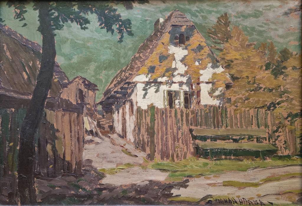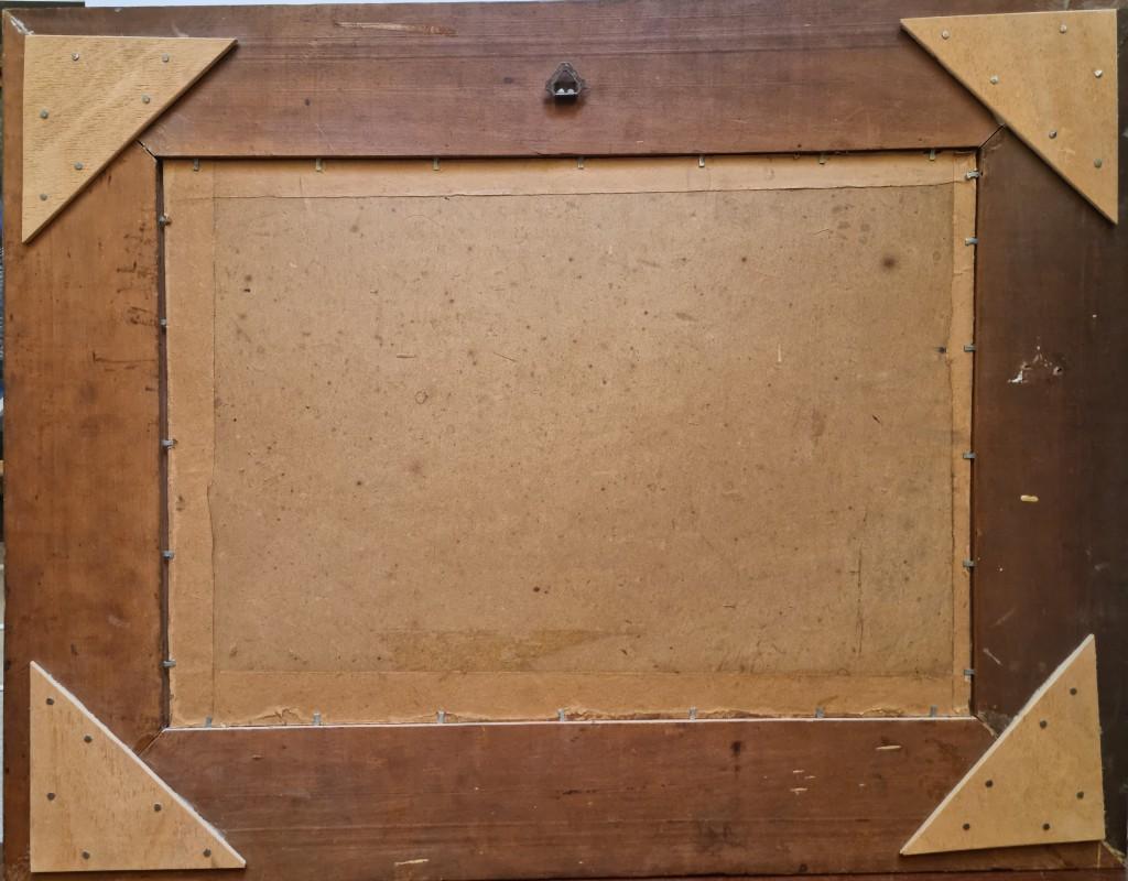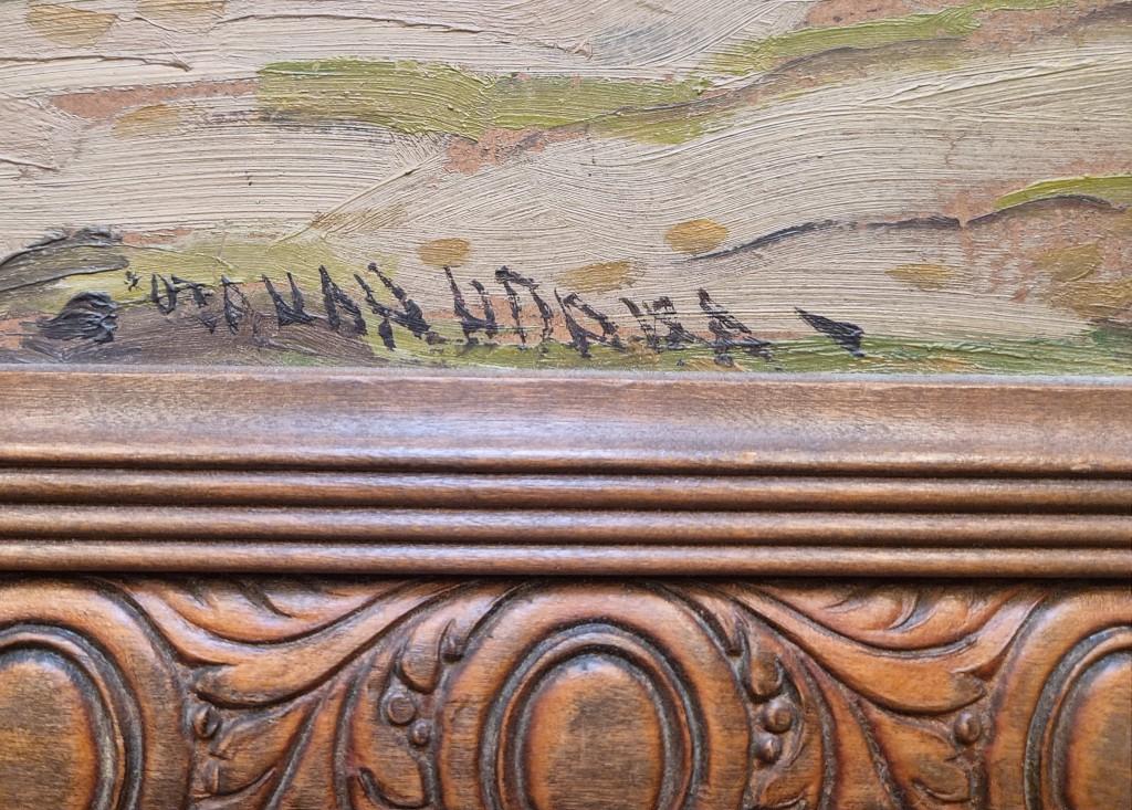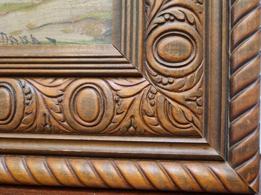 Obraz s rozměry 46 x 32 cm, s rámem 66 x 52 cm. Olej na kartonu. Signováno Otakar Hůrka. Řezbovaný rám je lehce ve vrtuli.
