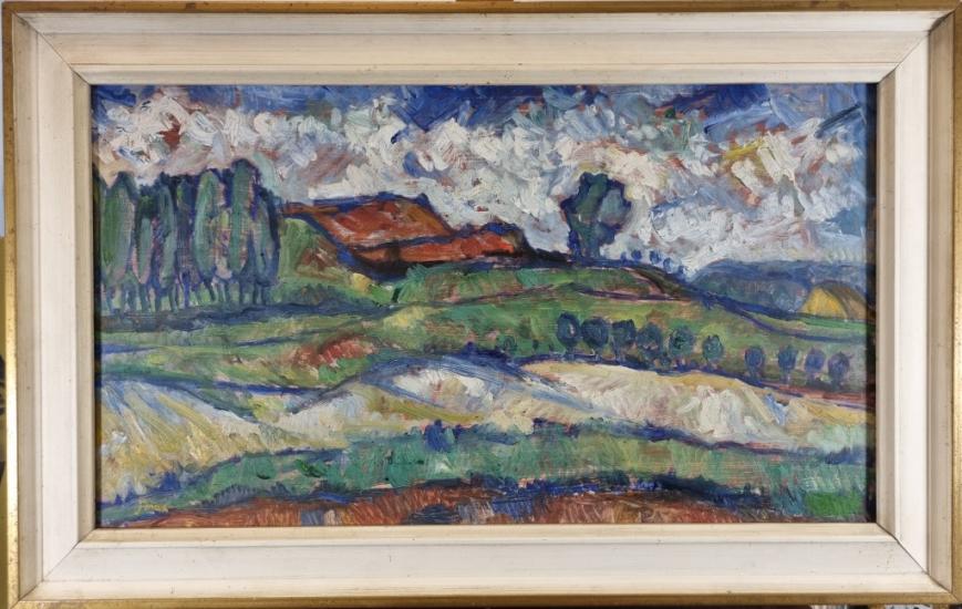 Olej na sololitu, rozměry malby 39x69 cm, s rámem 52x82 cm. Signováno v levém dolním rohu "Fmax".