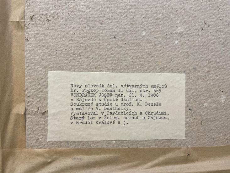 Olej na kartonu o rozměrech malby: výška 36 cm, šířka 48 cm, včetně rámu: výška 54 cm, šířka 43 cm. Signováno v pravém dolním rohu J. Vondráček. Zezadu autorský štítek.