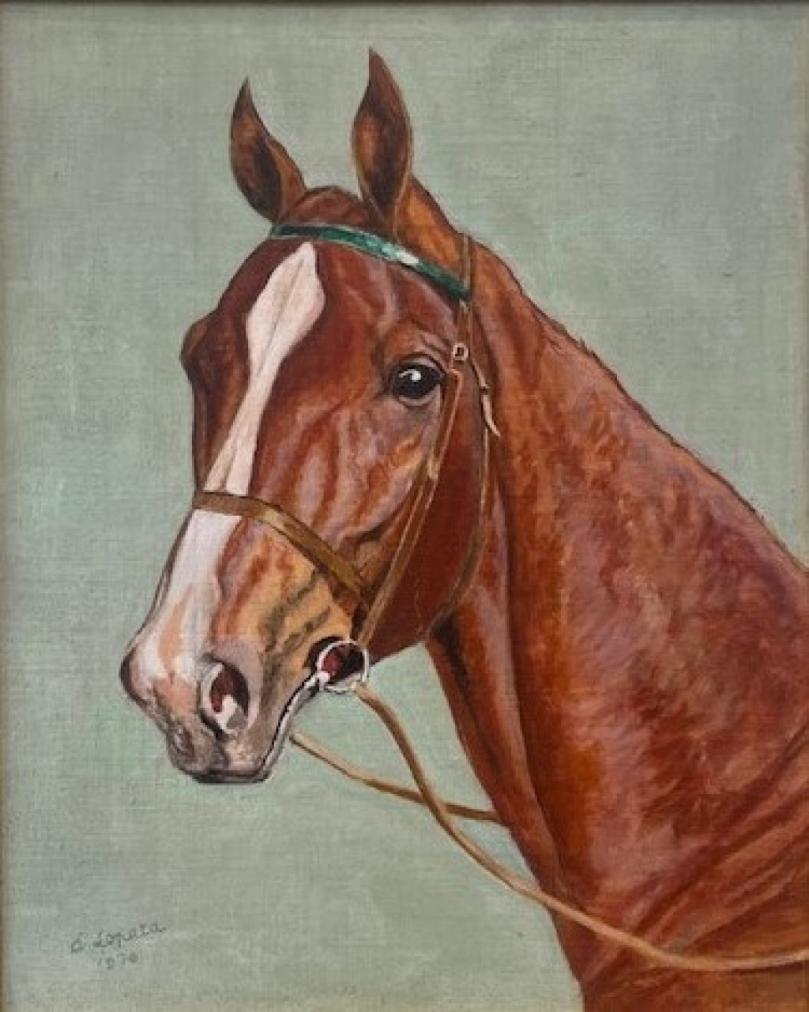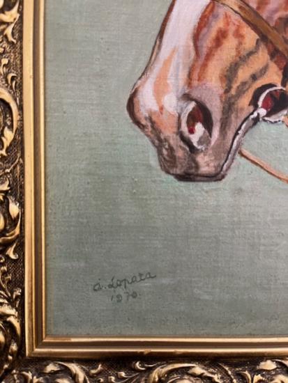 Portrét krásného ušlechtilého koně oříškové barvy s bílou lysinkou, ve zdobném rámu. Olej na sololitu. Rozměry malby 33,5 cm na výšku x 26,5 cm na šířku. Rozměry s rámem 35 cm na šířku x 42 cm na výšku. Signováno v levém dolním rohu A. Lopata 1970.