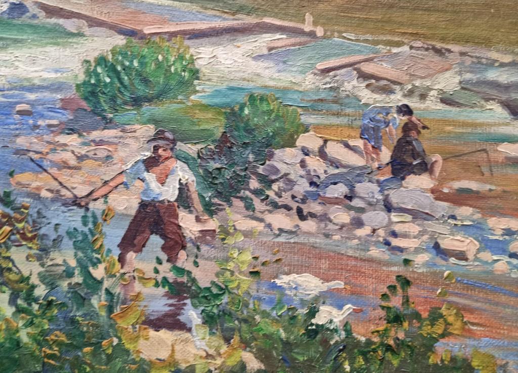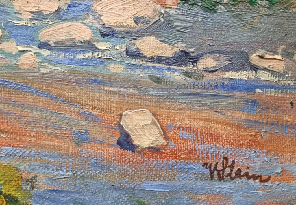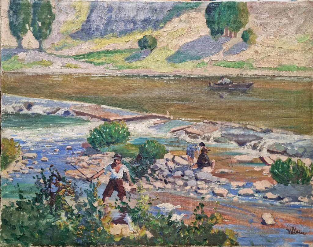 Svěží drobná malba pohledu na řeku a rybáře. Umělec v tomto díle maluje velmi sytými barvami, které používá nečekaně, při zobrazování kamenů či vodní hladiny. Toto dílo je skvělé díky jemným detailům, můžeme odhalit husy u břehu, či se zaměřit na postavy, které jsou věrně zachyceny v jen pár tazích. Olej na plátně, rozměr 47 x 37 cm, signováno viz foto "V. Stein".