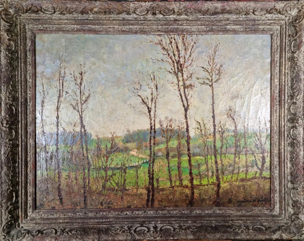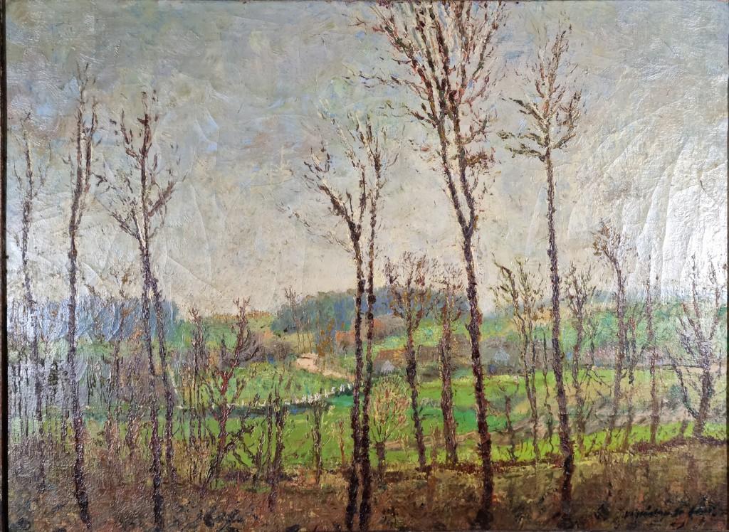 Tato malba nám nabízí pohled do krajiny, která se nejspíš probouzí ze zimy a chystá se znovu rozkvést. Zajímavý je obraz zejména rukopisem autora. Způsob práce s barvou a tahy, linkou je velmi specifický, působí roztřeseně a surově, díky čemuž působí obraz paradoxně realisticky, nebo může zdálky připomínat snímek. Olej na plátně, rozměry s rámem 96 x 75 cm, bez rámu 78 x 57 cm. Krakelace na povrchu malby. Signováno viz foto. Šafář.