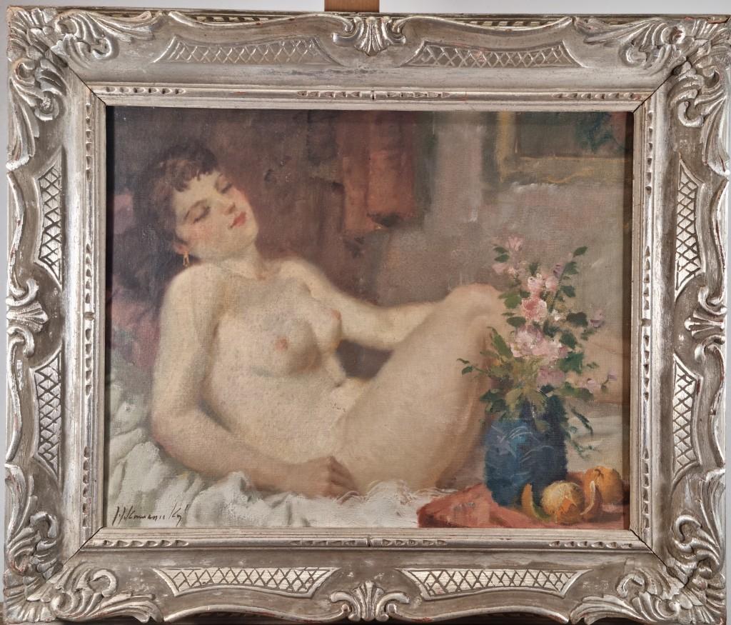 Josef Jiří Kamenický, nar. 1910, žák Nechleby. Olej na plátně 50x40 cm, dřevěný řezaný rám 68x58 cm. Signováno v levém dolním rohu "J. J. Kamenický". Pravý horní roh rámu poškozen.