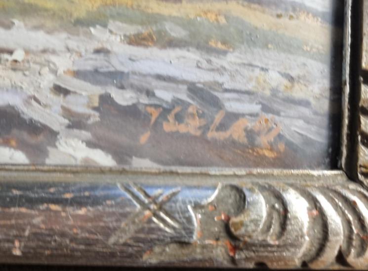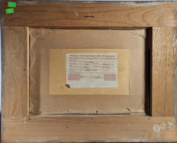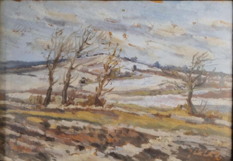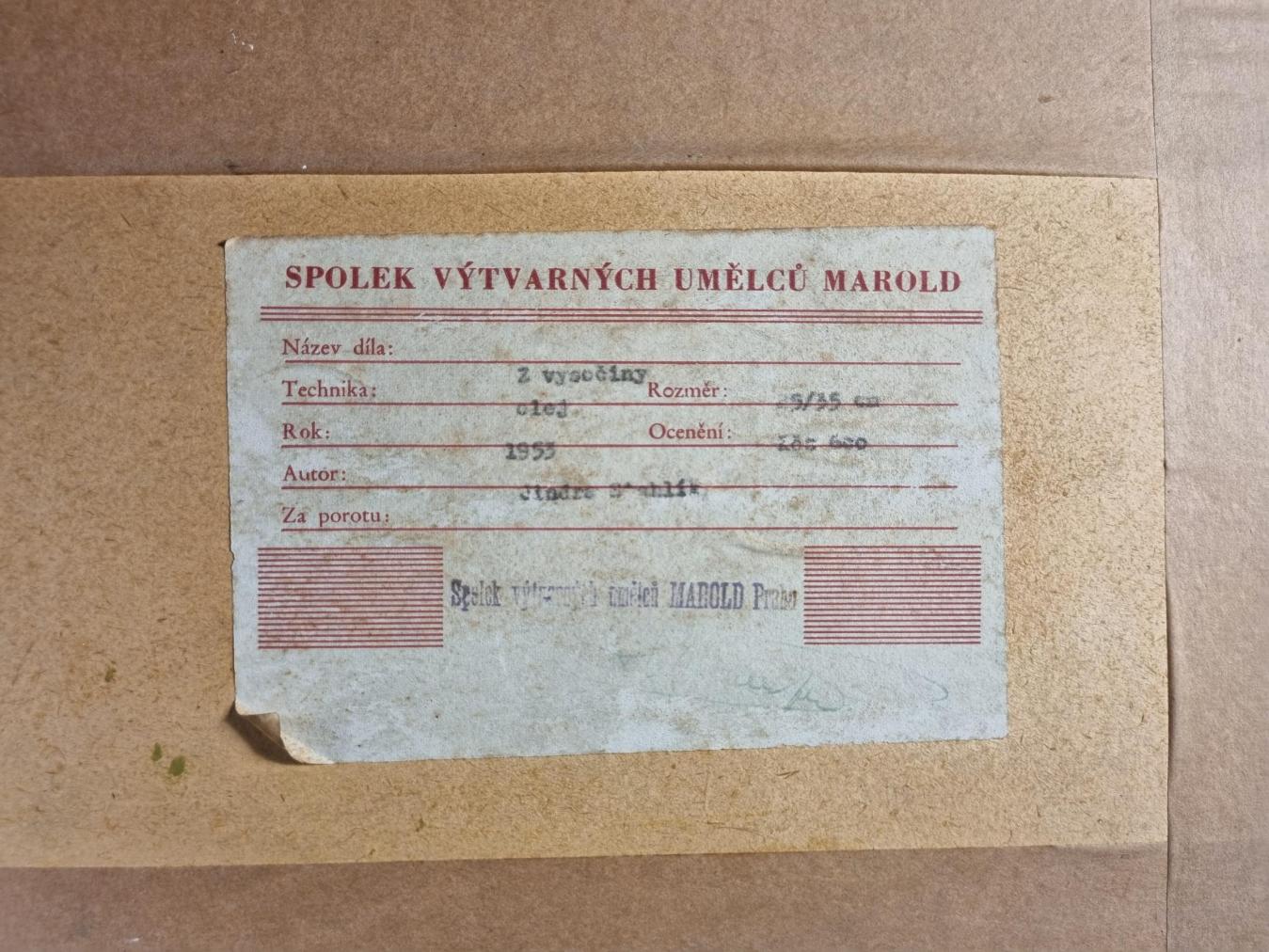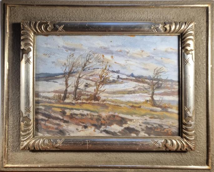 Dílo od malíře jménem Jindřich Stehlík. Umělec realisticky zachycuje krajinu Vysočiny v období prvního sněhu. Rozměry malby jsou 35 x 23 cm. Rozměry s rámem jsou 52 x 42 cm. Olej na papíře, zarámováno do širokého dřevěného rámu šedé a stříbrné barvy, pod sklem. Signatura se nachází na pravé straně dole: J. Stehlík. Z druhé strany díla nalepen autorský štítek s názvem díla a jménem autora. Datace 1955.