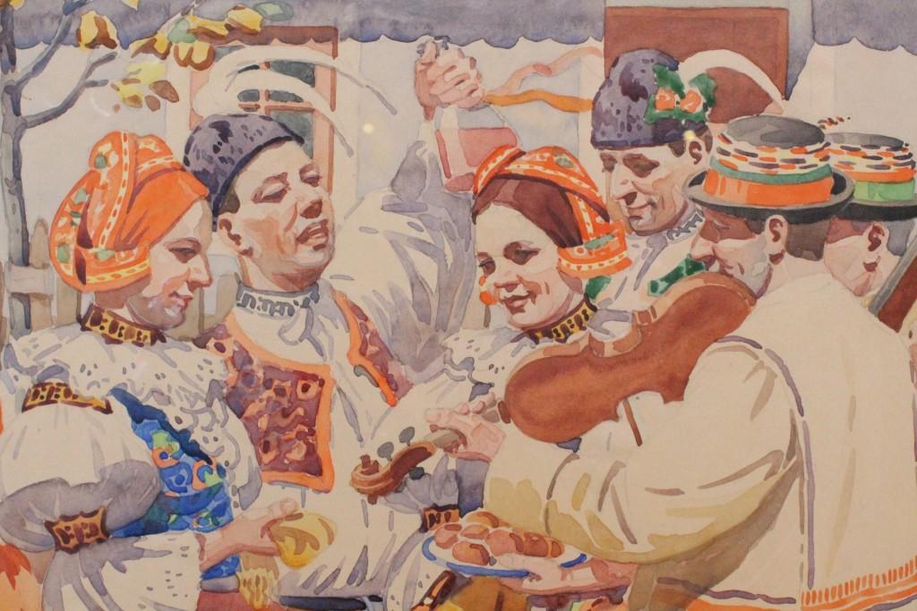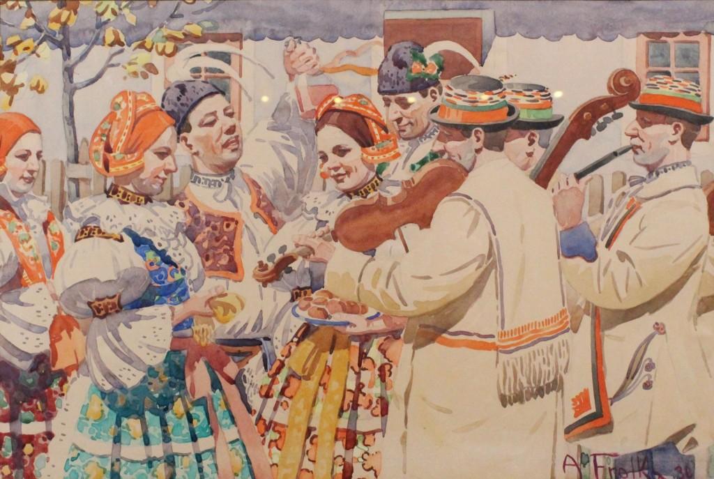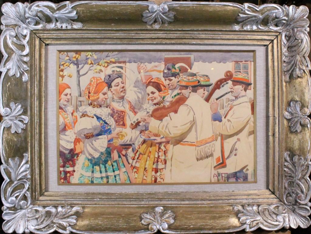 Asi nejmistrnější akvarel moravského malíře Antoše Frolky. Skvěle zachycena atmosféra hudby, vína, hodových koláčků, krojů a všemu co k Moravě patří.