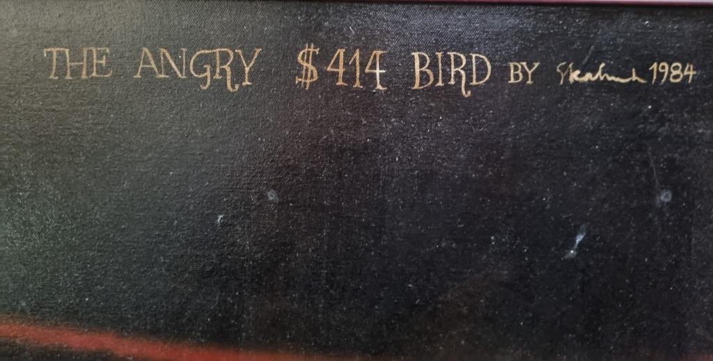 Osobitý styl a tělové barvy s krvavě červenou, na kontrastním tmavém pozadí, to je rukopis mezinárodně uznávaného českého malíře žijícího v Kanadě, Pavla Skalníka. Obraz zachycuje mužskou a ženskou postavu, z nichž každá hledí jiným směrem a letícího ptáka. Kombinovaná technika akrylu, oleje a spreje na plátně. Zarámováno. Signatura vlevo nahoře. The angry $414 bird by Skalník 1984. Rozměr malby 90 cm na výšku x 116 cm na šířku. Rozměr s rámem 96 cm na výšku x 121 cm na šířku.