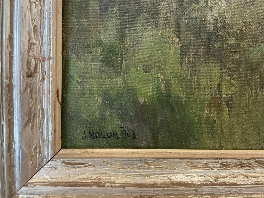 Rozměr obrazu 100 x 80 cm, včetně rámu 115 x 95 cm, olej na plátně, signováno v levém dolním rohu " J. Holub " .