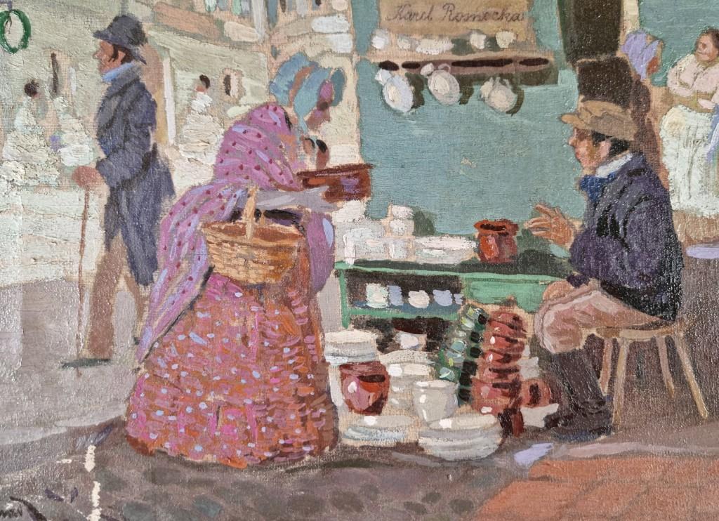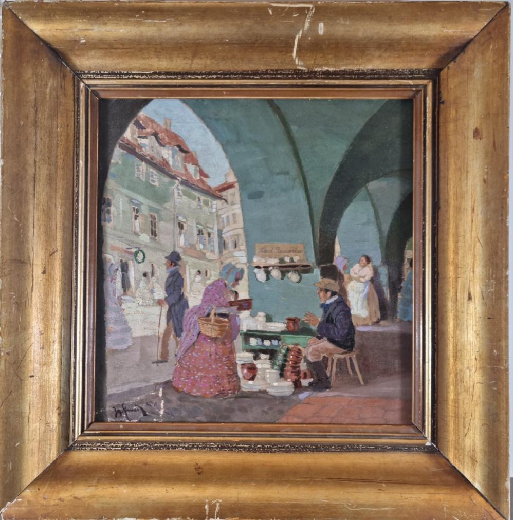 Na této malbě můžeme vidět idylický výjev z městského tržiště. Lidé procházejí podloubím a náměstím a shlukují se, postávají a baví se. Z malby dýchá živá a veselá atmosféra, kterou autor nechává vyznít především prostřednictvím sytých, pestrých barev. Malba je budována barevnými plochami, které jsou dokresleny tu a tam jemnými detaily, nápisy, odrazy světla, které přidávají dílu na autentičnosti. Dílo je zasazeno do masivního zlatého rámu. Olej na plátně, rozměry s rámem 60 x 59 cm, bez rámu 33 x 32 cm. Signováno viz foto - "Jos. Strnad,,