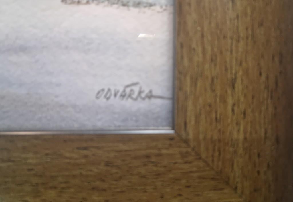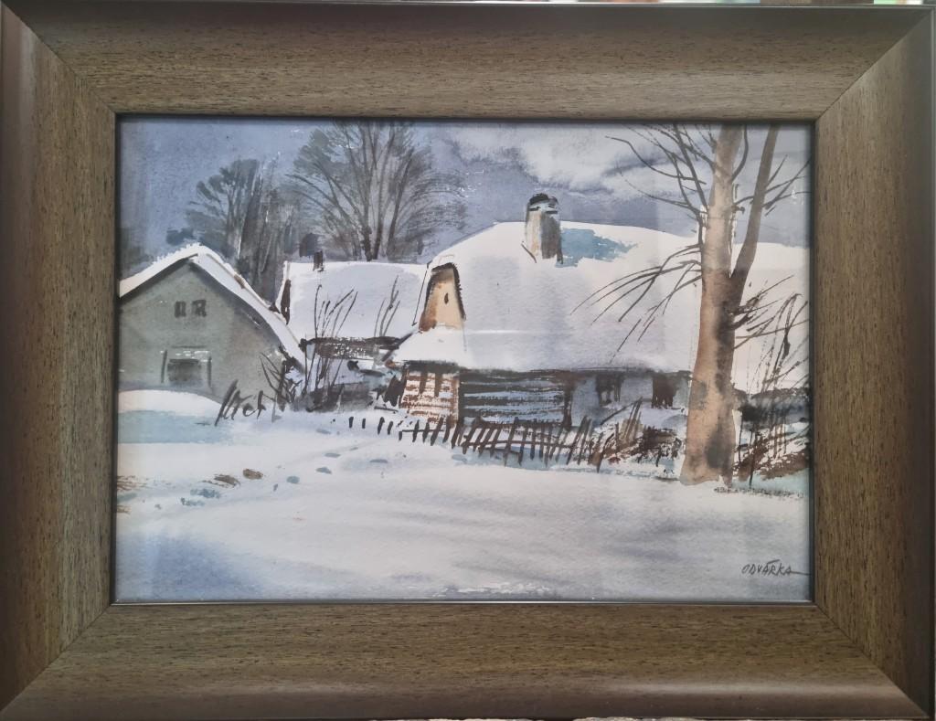 Akvarel na papíře, rozměry s rámem 37 x 29 cm, bez rámu 28 x 20 cm. Něžná sněžná krajinka s výjevem z vesnice, se zasněženými chaloupkami a vesnickou atmosférou. Autorem je Jan Odvárka, signatura viz foto.