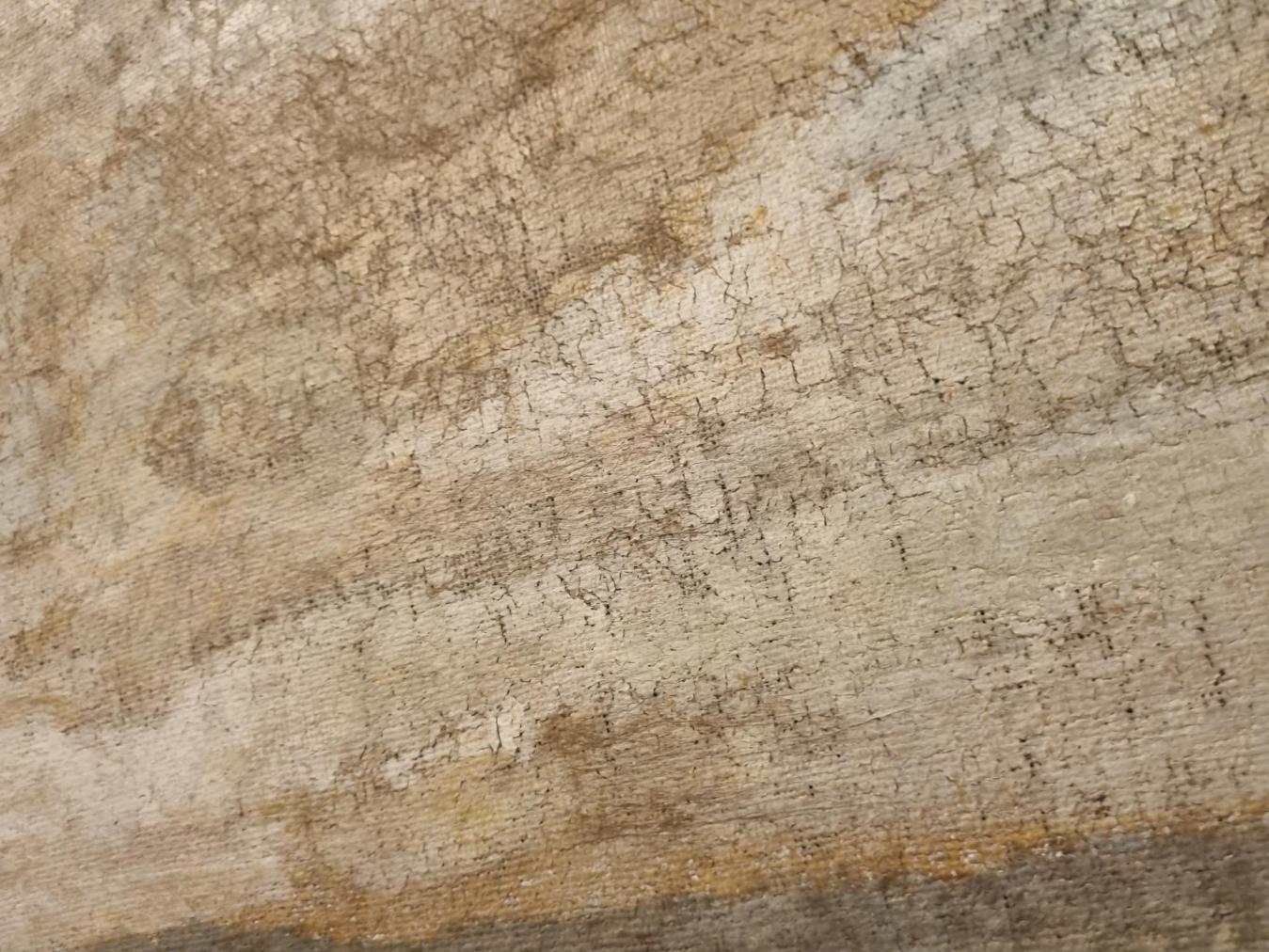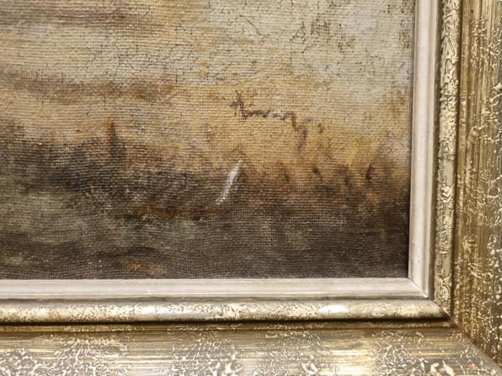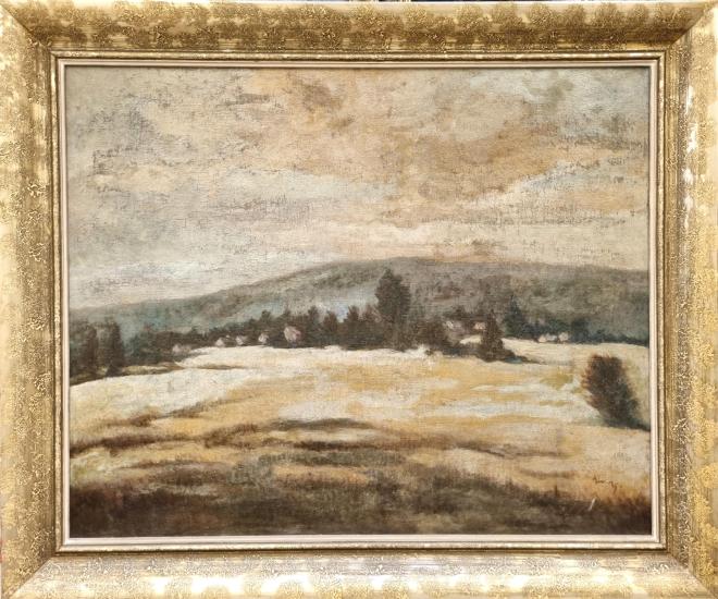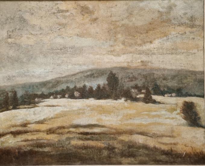 Rozměrná malba vyobrazující soumrak v zimní kopečkovité krajině. Autor zachycuje potemňující oblohu s lehce narůžovělým nádechem a modrými tóny, které se odrážejí ve sněhu. Kontrastně zde působí rozostřené siluety stromů, které na obzoru splývají a vpíjí se do tmavého horizontu. Olej na plátně. Zarámováno do dřevěného rámu zlaté barvy. Rám má menší poškození v pravém horním rohu ze přední i ze zadní strany. Barva obrazu je místy popraskaná a na některých místech vydrolená, nebo je nanesena tenká vrstva - vidíme skrz plátno. V levém dolním rohu je plátno propíchnuté - cca 1 x 1 mm. Rozměry malby jsou 104 x 84 cm. Rozměry s rámem jsou 123 x 103 cm. Signatura se nachází v pravém dolním rohu viz. foto.