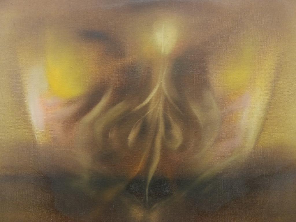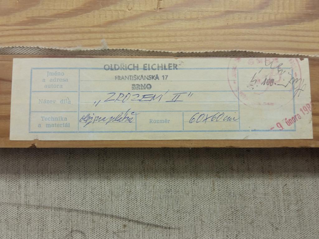 Další z řady symbolických obrazů od autora Eichlera. Jak název napovídá, malíř zde tématizuje moment zrození. Motivy jsou v náznaku, rozpouštějí se do okolí a autor také pracuje se září, kterou vytváří odstíny bílé a žluté barvy. Olej na plátně, rozměr malby 60 x 60 cm, rozměr s rámem 72 x 72 cm. Signováno vzadu "Eichler 82 - Zrození II."