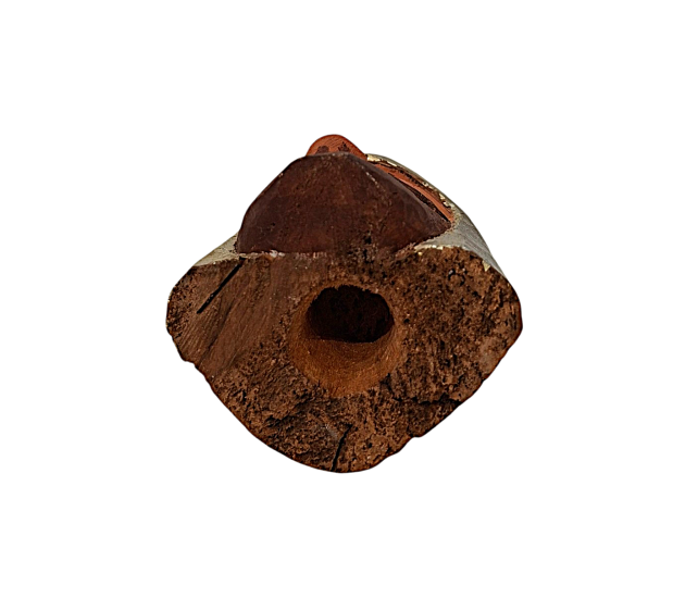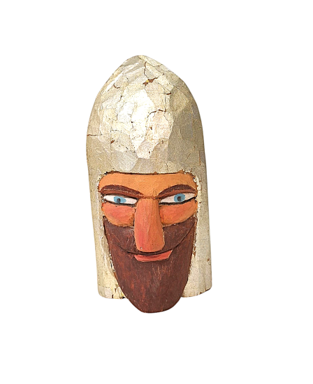 Dřevěná vyřezávaná hlava zarostlého rytíře. Malováno na dřevě. Výška 14,5 cm, šířka 7 cm, hloubka 6,5 cm. Nesignováno.