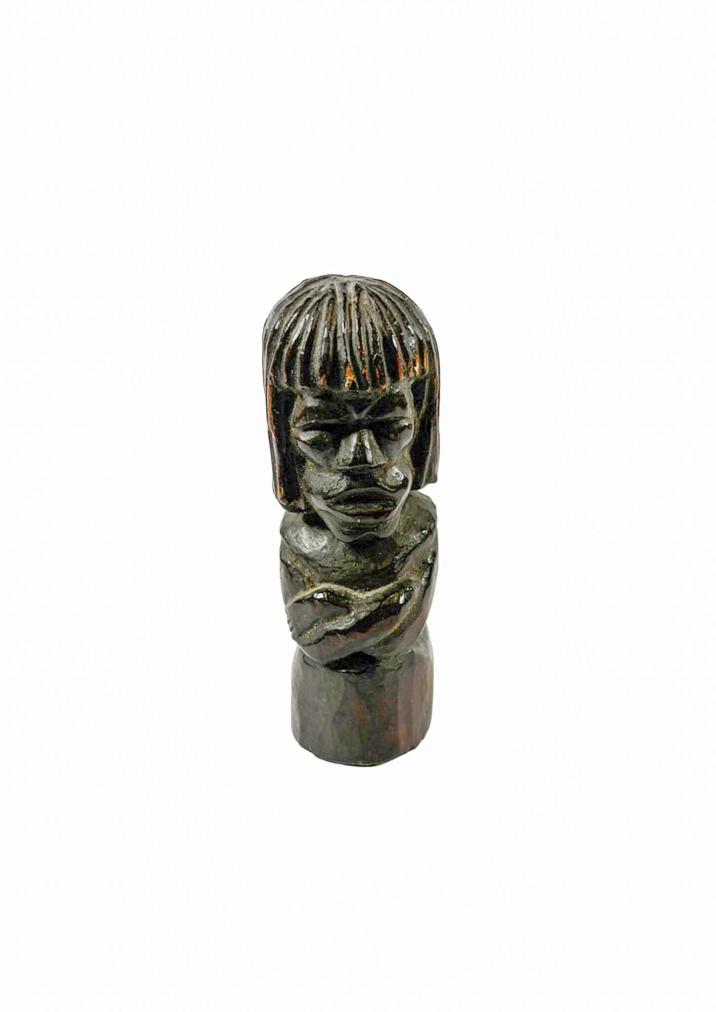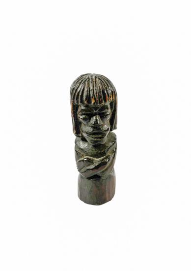 Figurka černošského bůžka působí rozzlobeně. Ve tváři má jasné, ostré rysy a vlasy po ramena. Povrch je barvený černým odstínem. Dřevo, výška 9 cm, hloubka 3 cm, podstava 3 x 2,5 cm. Místy je černá barva lehce setřená. Neznačeno - nesignováno.