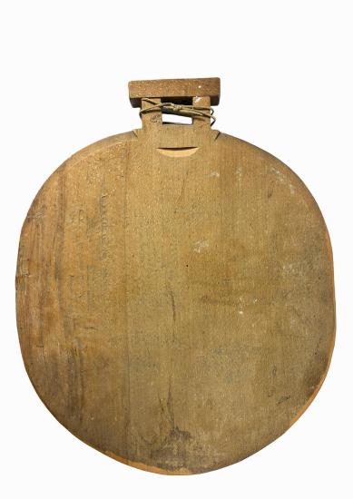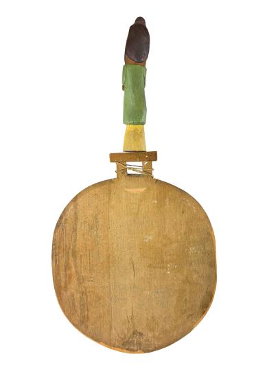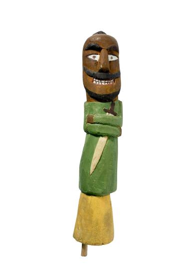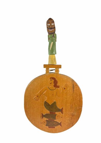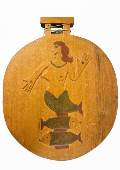 Dřevěný objekt od Aloise Mikulky. Spodní část tvoří plocha oválného tvaru, na které velmi jemným reliéfem vytváří autor motiv mořské pany a dvou ryb. Reliéfní plochy vyplňuje barvou, jinak nechává vyznít přirozený charakter dřeva. Nad mořsou pannou výhružně postává muž s kudlou. Dřevo, výška 58 cm, v nejširším bodě 29,5 cm. Neznačeno.