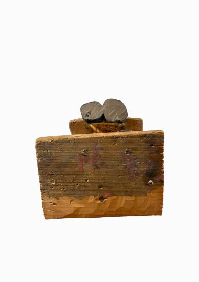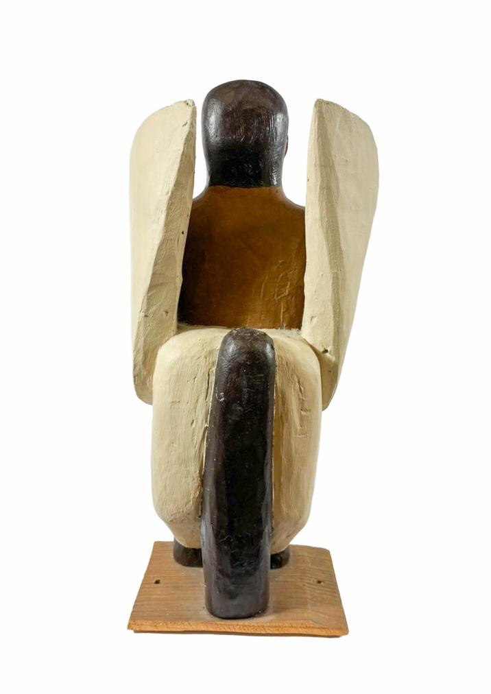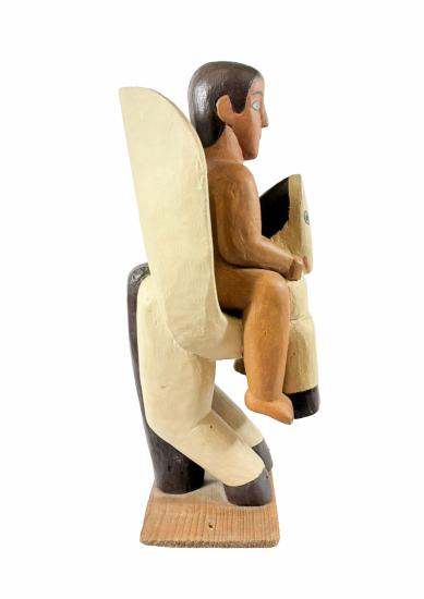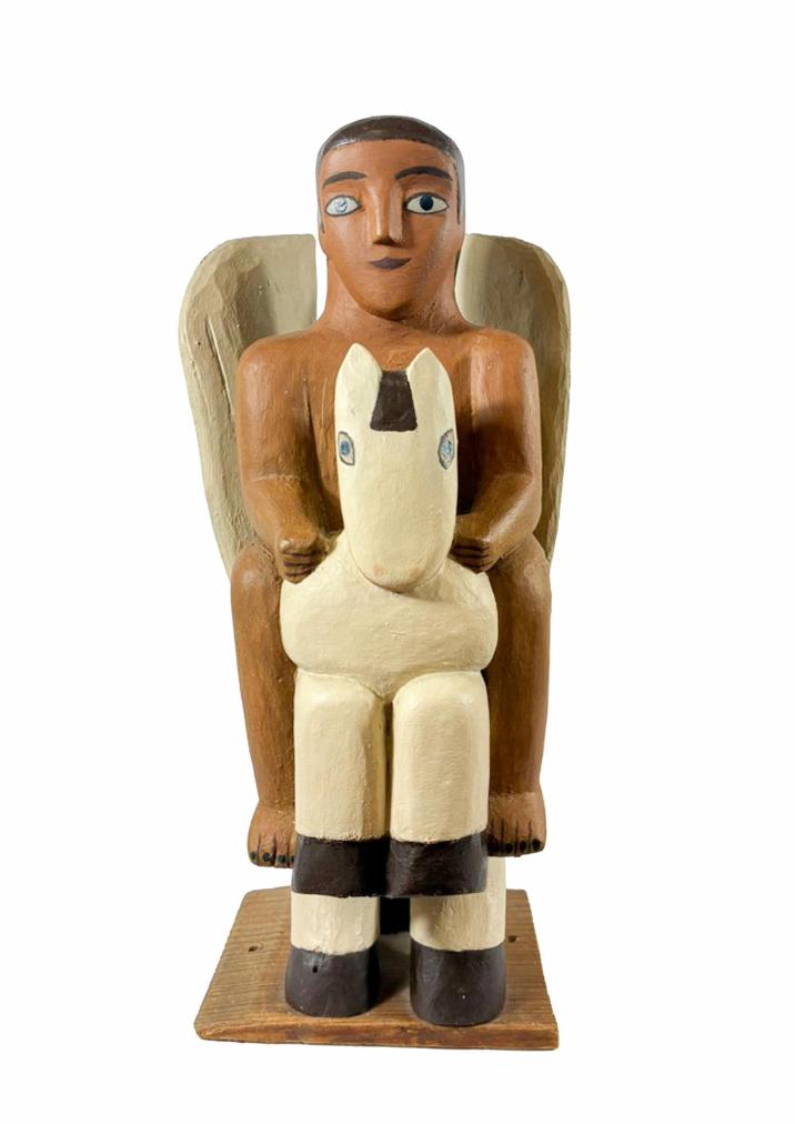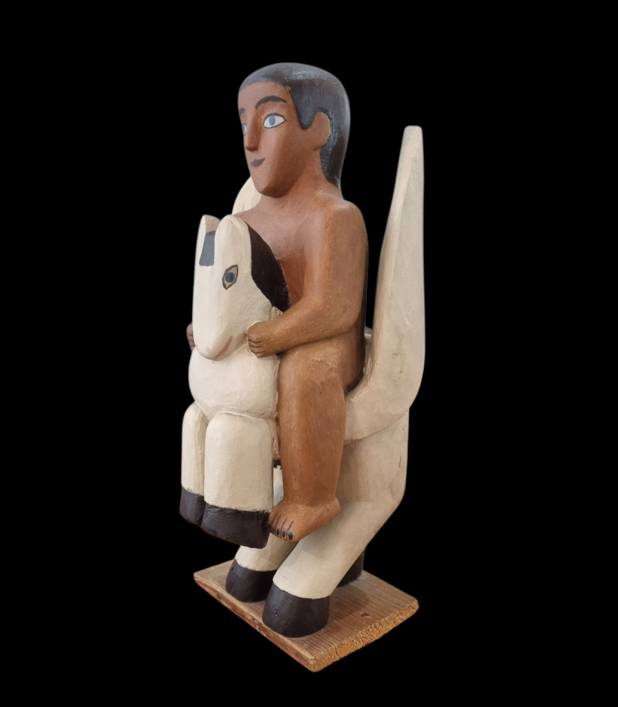 Dřevěná soška od Aloise Mikulky. Autor pracuje s vtipem a nadsázkou, předimenzovaný člověk sedí na okřídleném koni, který je velikostí skoro menší, než muž. Mikulka nechává vyznít motivy v čistých plochách, tvoří obrysové linky pouze kolem očí, plochy doplňuje o drobné detaily. Osobitá stylizace dodává dílu lehkost a pohádkovost. Dřevo, výška 30,5 cm, hloubka 13,5 cm, v nejširším bodě 14,5 cm, podstavec 12 x 8,5 cm. Neznačeno.