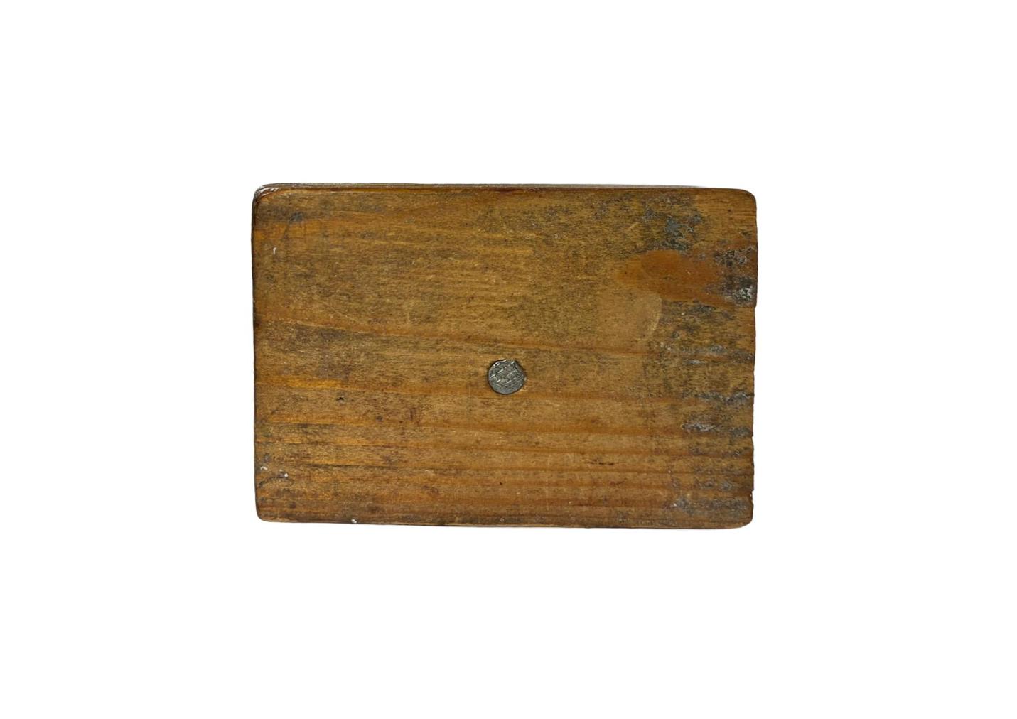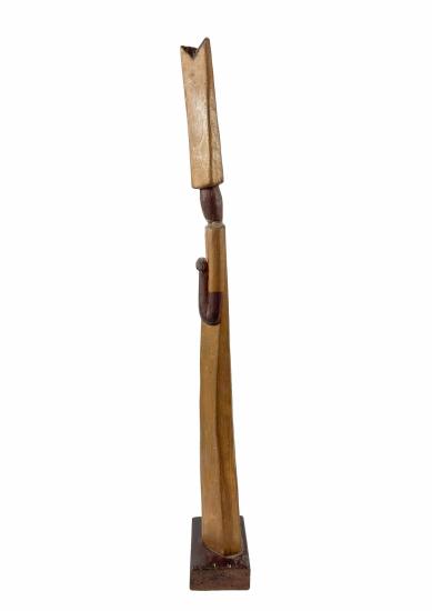 Roztomilá dřevěná postava podlouhého vzhledu od Aloise Mikulky. Autor často sahá po vizuálním vtipu v podobě předimenzovaných částí, zjednodušení a použití zkratky. U této sošky je vtipným mometem obličej, který autor maluje ve stylu dětské kresby. Postava má na hlavě velmi dlouhou korunu. Dřevo, výška 38 cm, v nejširším bodě 3,5 cm, podstava 4 x 6 cm. Neznačeno.