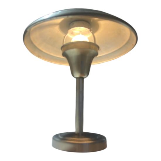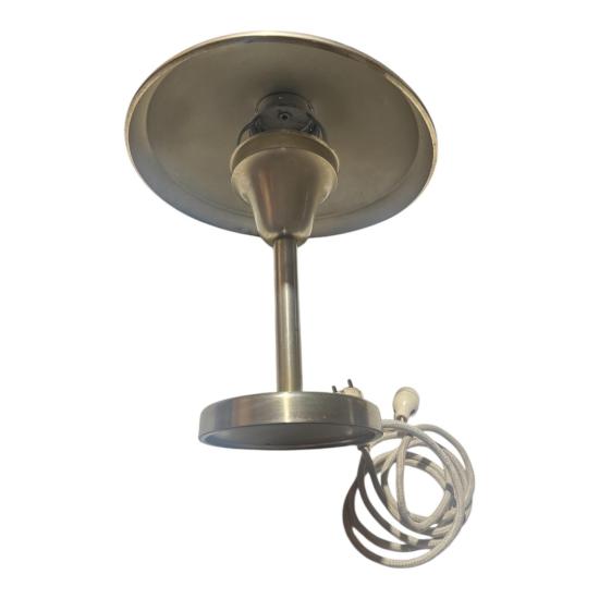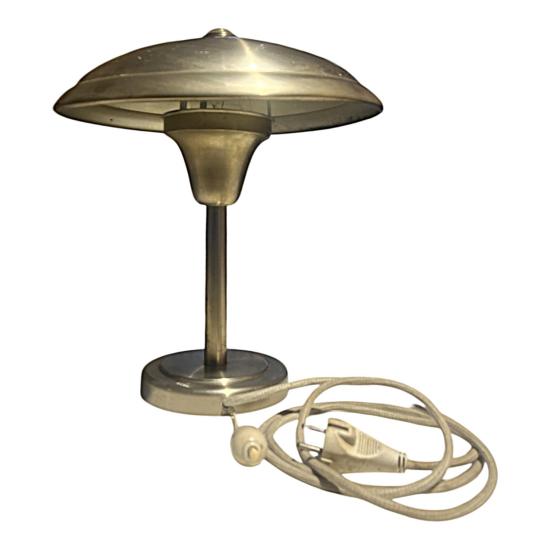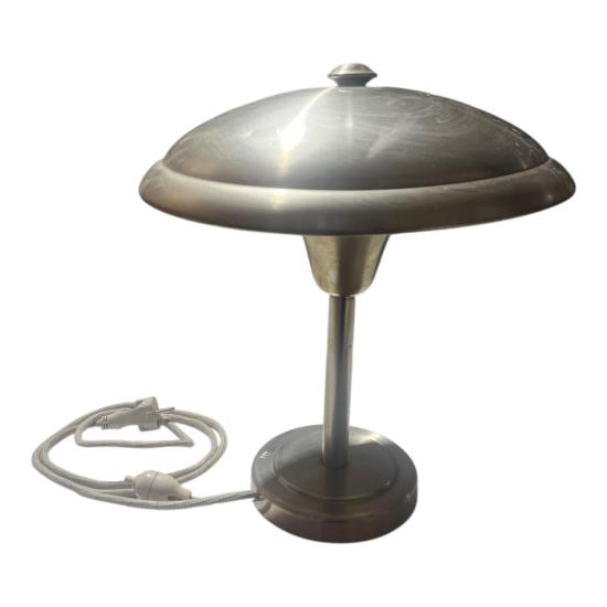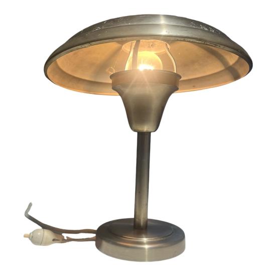 Starožitná lampa v nadčasovém designu s poniklovaným povrchem. Lampa měří na výšku 40 cm, průměr stínítka je 34 cm. Průměr podstavy je 16 cm. Lampa je v dobrém stavu a plně funkční. Na povrchu se nacházejí místy drobné oděrky. Neznačeno. Prodáváme jako nefunkční.