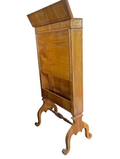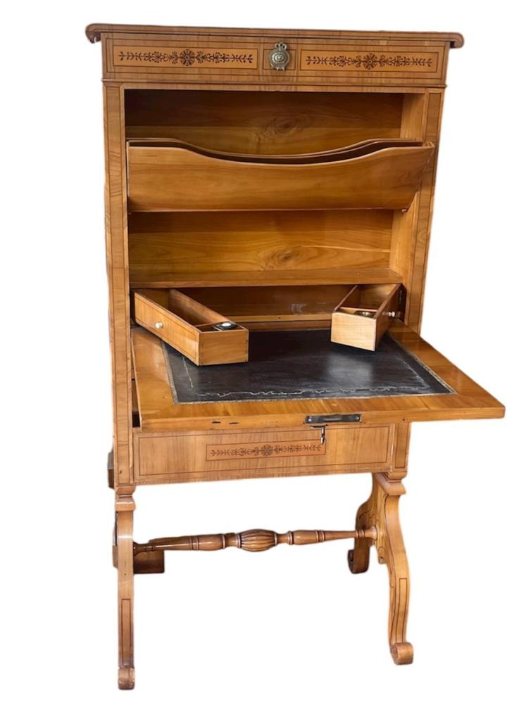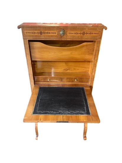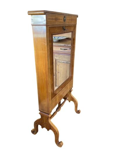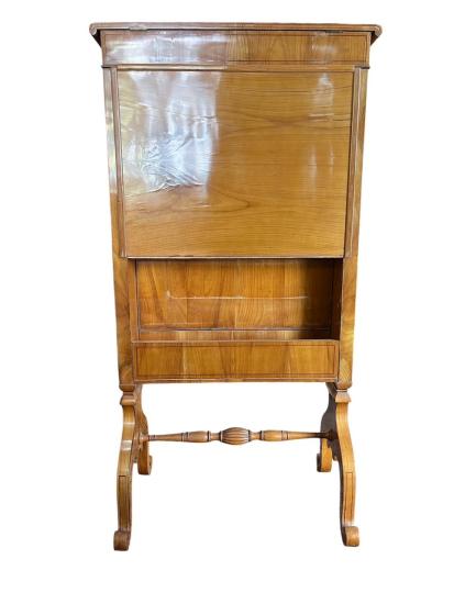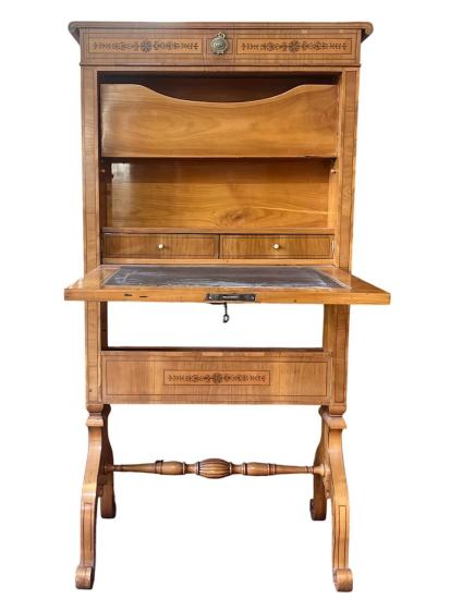 Krásný starožitný kus nábytku, sloužící jako dámský psací stolík s vyklápěcí deskou, zrcadlem a tajnou zásuvkou. Otevírání je na klíč, uvnitř se nachází pořadače na dokumenty a dva výsuvné šuplíky. Třešňové dřevo, styl Biedermeier. Na výšku měří 128 cm, na šířku 68 cm. Hloubka je 13 cm, rozpětí nožek je 41 cm. Psací deska má při vyklopení hloubku 46 cm a šířku 54 cm. Stolík je v dobrém stavu, ale nese lehké známky opotřebení a stáří. Neznačeno.