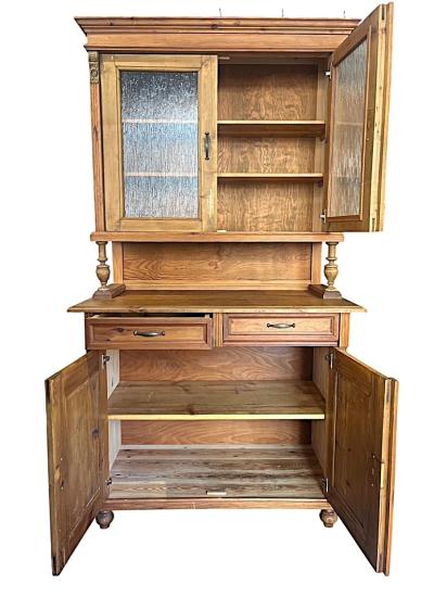 Starožitný selský příborník z měkkéhodřeva. Částečně restaurovaný a předělaný na modrní způsob / šuplíky s pojezdy.../. Na výšku měří 204 cm. Šířka spodní části je 112 cm, hloubka 58 cm. Hloubka horní části je 33 cm. Povrchová úprava je místy ošoupaná, na pravé straně nahoře dva vrypy ve dřevu. Možno rozdělat na dva kusy.