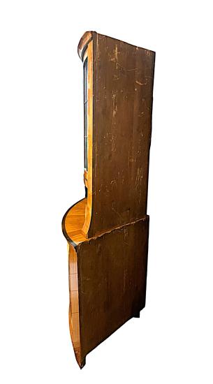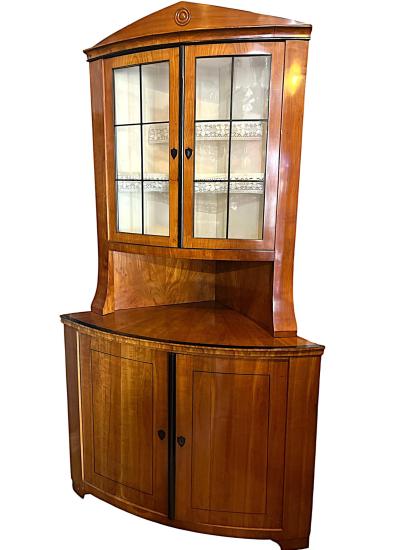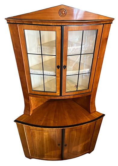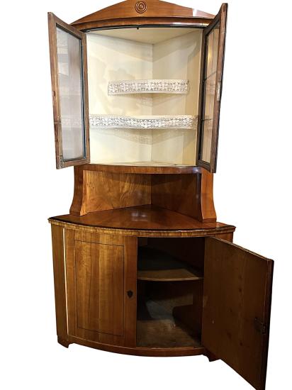 Starožitná skříňka sloužící jako kuchyňský kredenc/ příborník, v praktickém rohovém provedení, ve stylu Biedermeier. Ve velmi dobrém stavu. Na výšku měří 196 cm, na šířku v nejširším bodě 112 cm. Hloubka je 63 cm. Délka bočních stran je 75 cm.