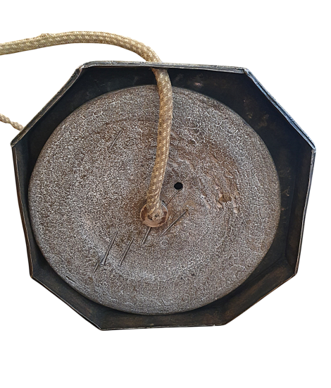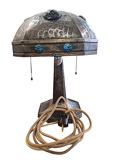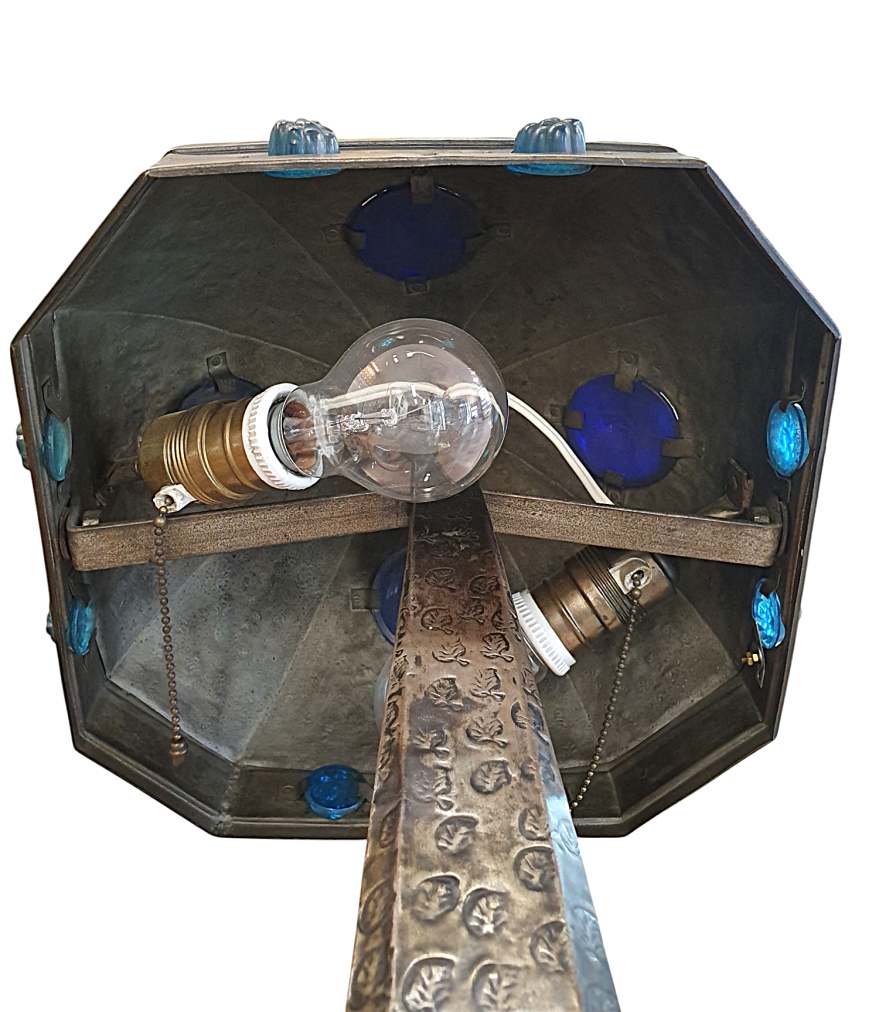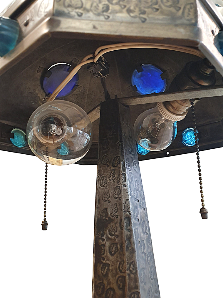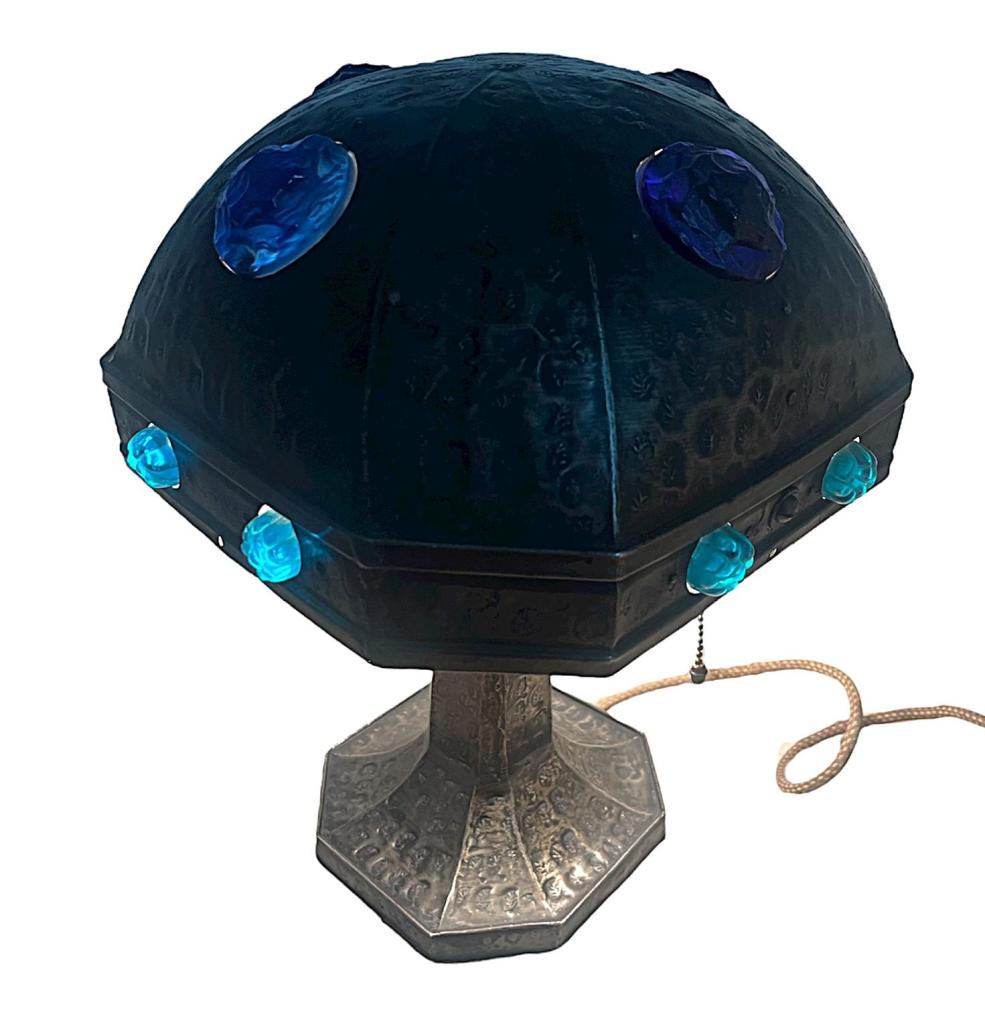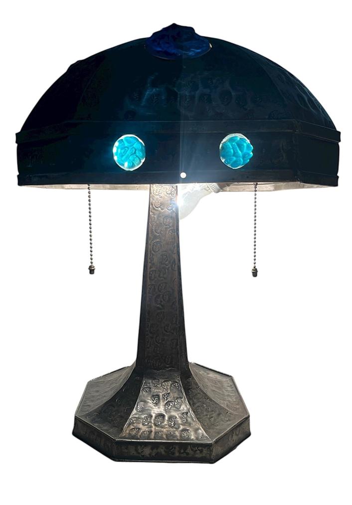 Starožitná stolní lampa s unikátním designem ve stylu secese. Mosazná lampa je ozvláštněna prvky z hutního skla, které při svitu lampy vydávají tlumený modrý jas. Lampa je funkční, s jednotlivým řetízkovým zapínáním dvou žárovek. Lampa měří na výšku 40 cm. Stínidlo má průměr 28 cm, podstava má rozměry 18 x 18 cm. Lampa je v perfektním stavu bez poškození, textilie kterou je potažený napájecí kabel se v jednom místě blízko podstavy mírně trhá.