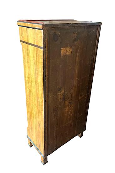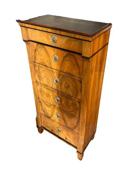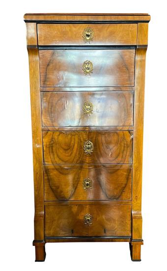 Starožitná dřevěná skříňka/ sekretář se šesti uzamykatelnými šuplíky. Ve skvělém stavu, zámky jsou funkční. Ořechové dřevo, dýha. Na výšku měří 140 cm, na šířku 64 cm. Hloubka je 37 cm. Jednotlivé šuplíky měří na šířku 52 cm a hloubku mají 28 cm. Neznačeno.