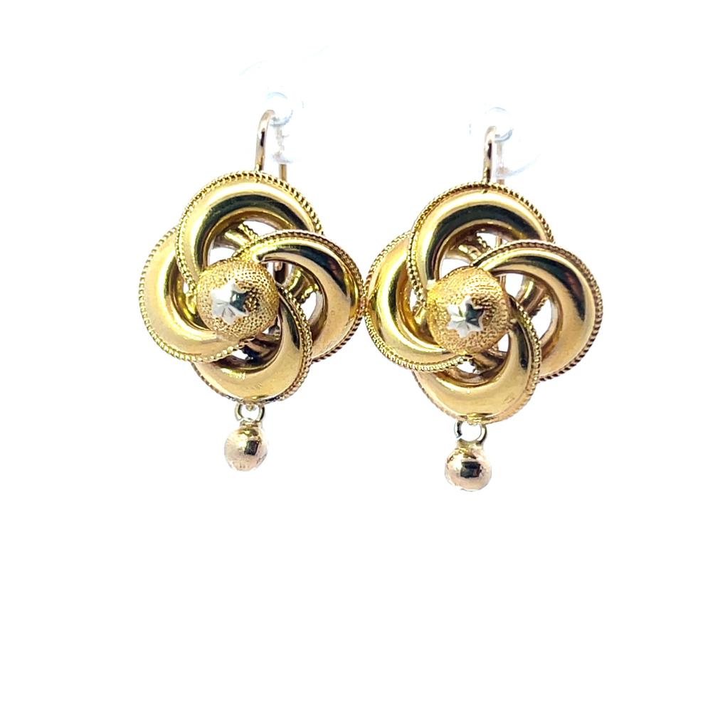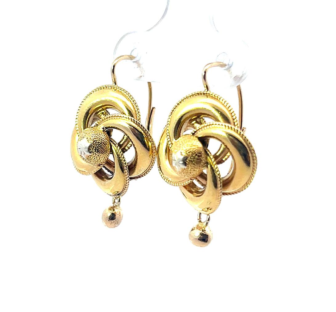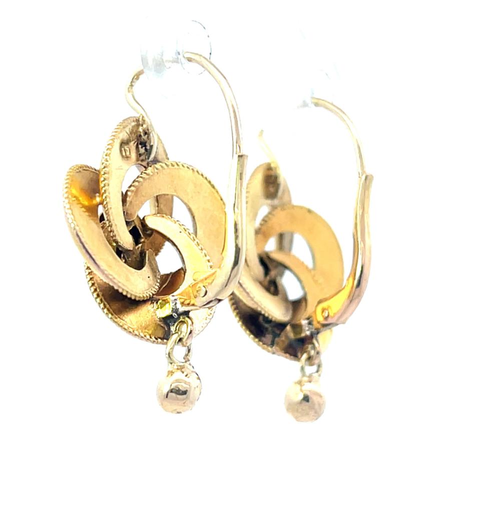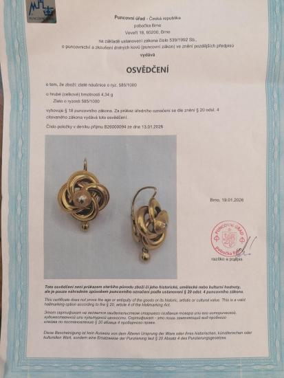 Zlaté náušnice o ryzosti 585/1000, osvědčení z PÚ. Váha 4,35 g, výška 27,5 mm, v nejširším bodě 17 mm. Na zadní straně náušnic jsou stopy po opravě - viz foto. Vrchní zadní část jedné náušnice má prohlubeň v místě značky zlatníka - šperk je z dutého zlata.