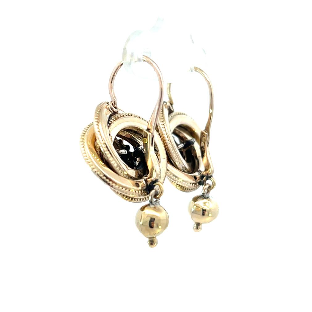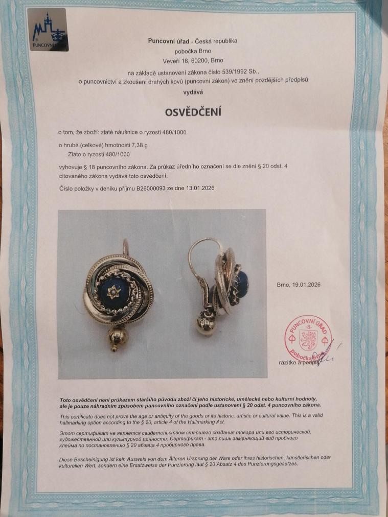 Starožitné zlaté náušnice o ryzosti 480/1000, osvědčení z PÚ. Váha 7,38 g, výška 33,5 mm, v nejširším bodě 19 mm.