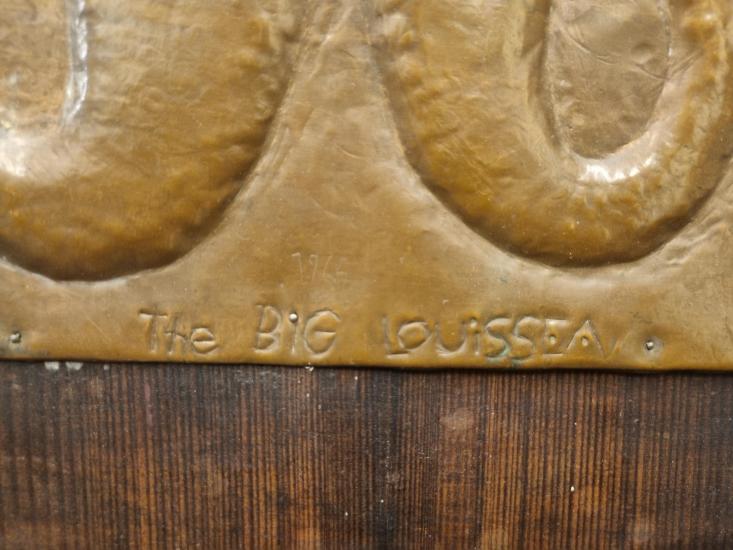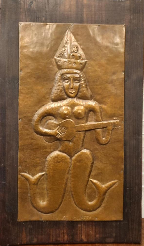 Originální dílo od Aloise Mikulky s námětem mytické postavy Meluzíny, která hraje na kytaru. Měděný reliéf postavy s typickou Mikulkovou stylizací vypadá skvěle, umělec dokázal v obrazech vytvářet vizuální vtipy, do čepce ženy, který je zároveň lodí, schoval motiv muže. Měděný reliéf na dřevě, rozměry 62 x 36 cm. Signováno uprostřed "The big Louissea".